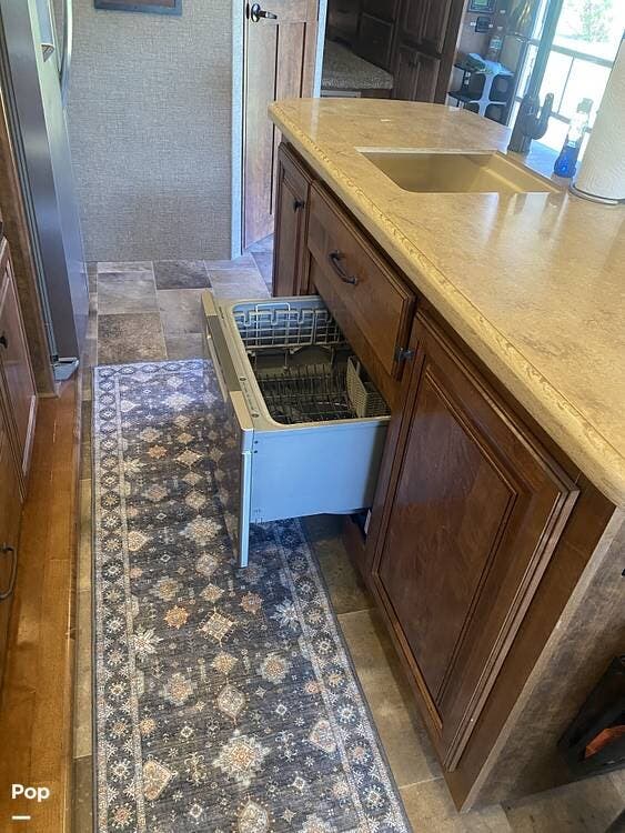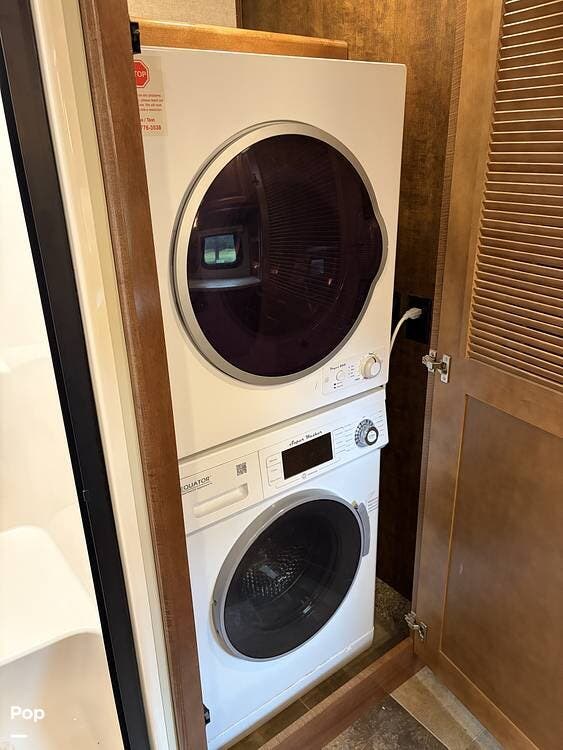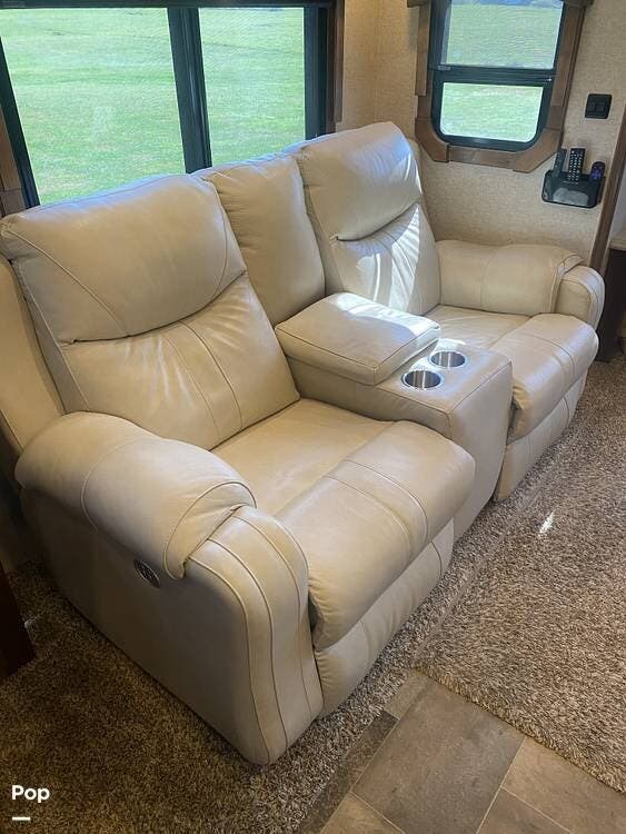 Other key features are a dishwasher, a separate washer and dryer, leather recliners and a residential refrigerator as well as leveling jacks.