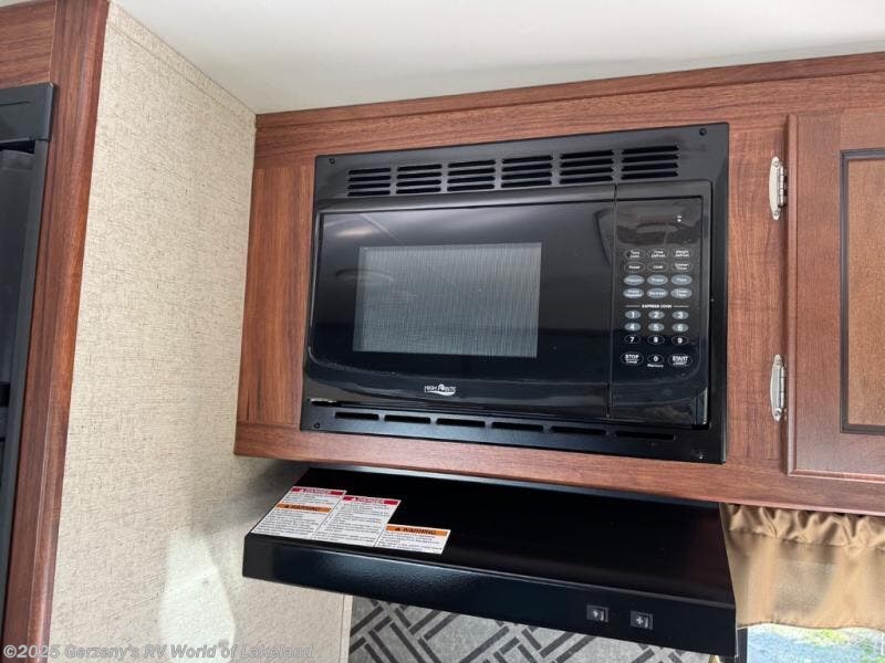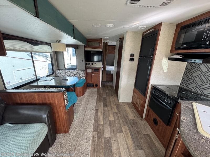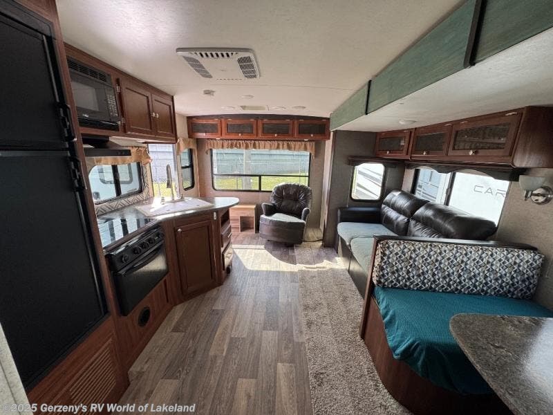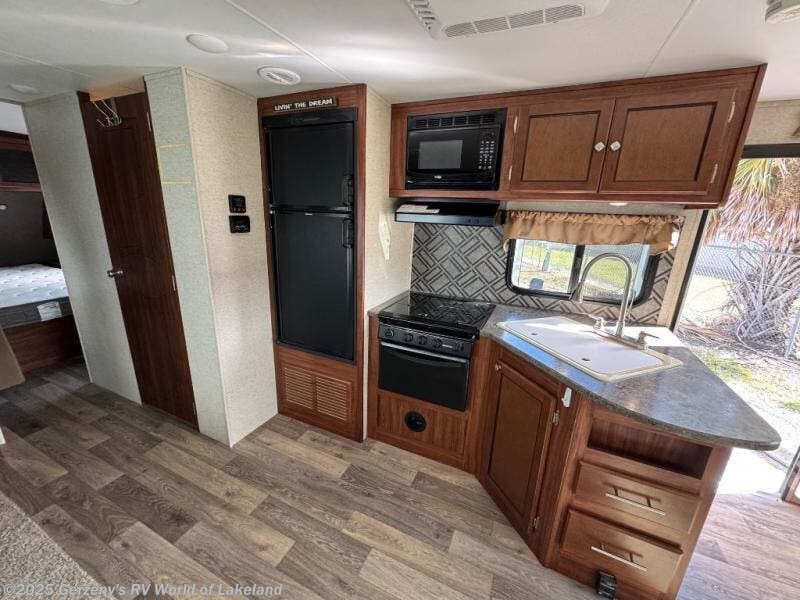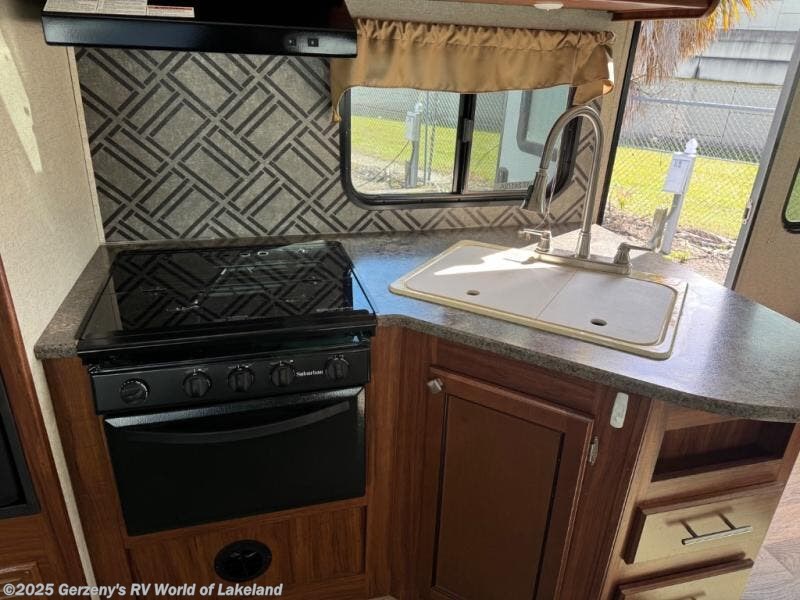 On the opposite side you will find the kitchen amenities. There is an angled countertop with a double sink, three burner range, and refrigerator. You will enjoy the extra storage in the overhead cabinets allowing room to pack your favorite dishes, snacks, and/or pots and pans.