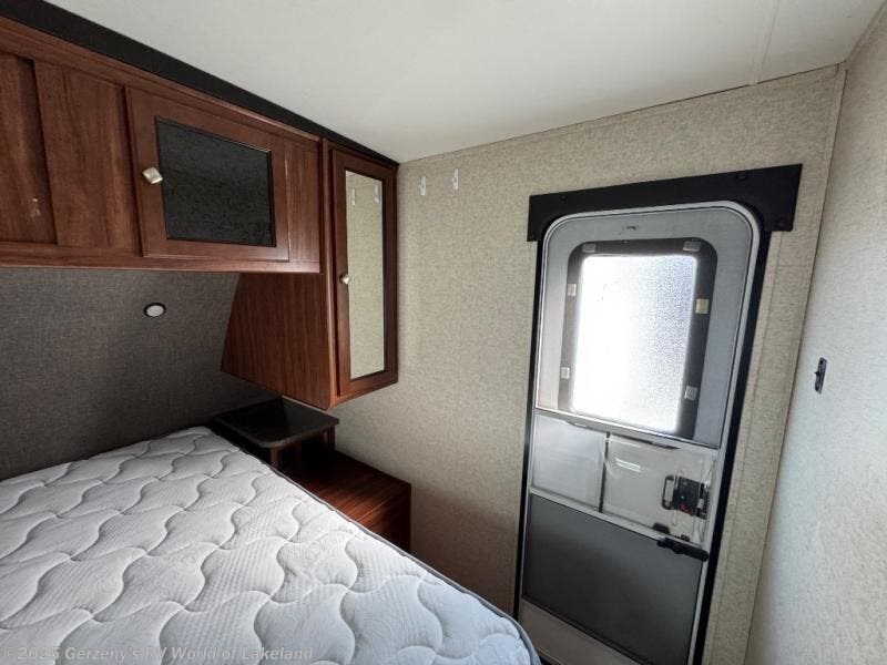The front bedroom features a second entry into the trailer, a queen bed along the front wall with nightstands and wardrobes on each side, plus more!