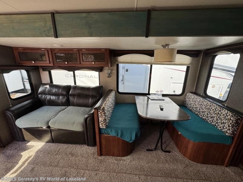 As you step inside model 27 to your left are two recliners with an end table between, and overhead cabinetry along the rear wall. Along the roadside there is a slide out sofa and booth dinette providing additional seating for family and friends. Next to the slide there is a cabinet with TV.