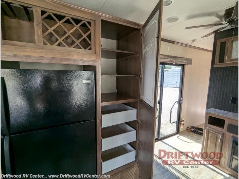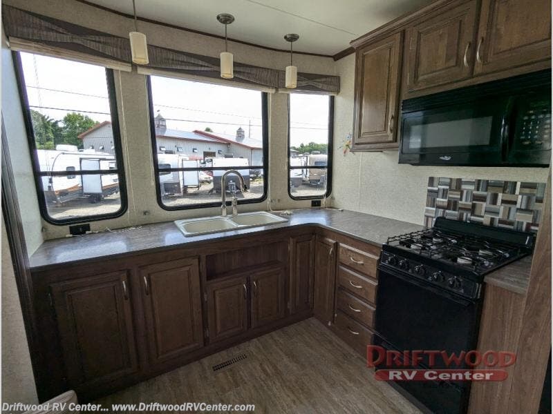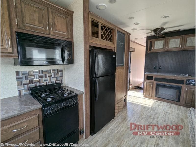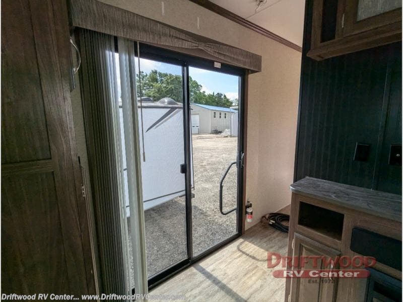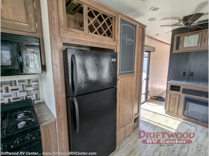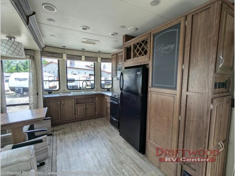 Step inside the glass patio doors in front. Once inside find a front corner kitchen featuring a large pantry for storage, an 18 cu. ft. refrigerator, and four burner residential range with overhead microwave. There is plenty of counter space for prep work, and a double kitchen sink with storage cabinets above and below for all of your dishes and things.