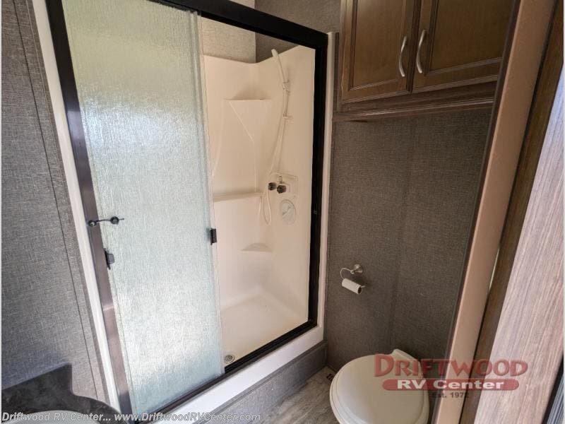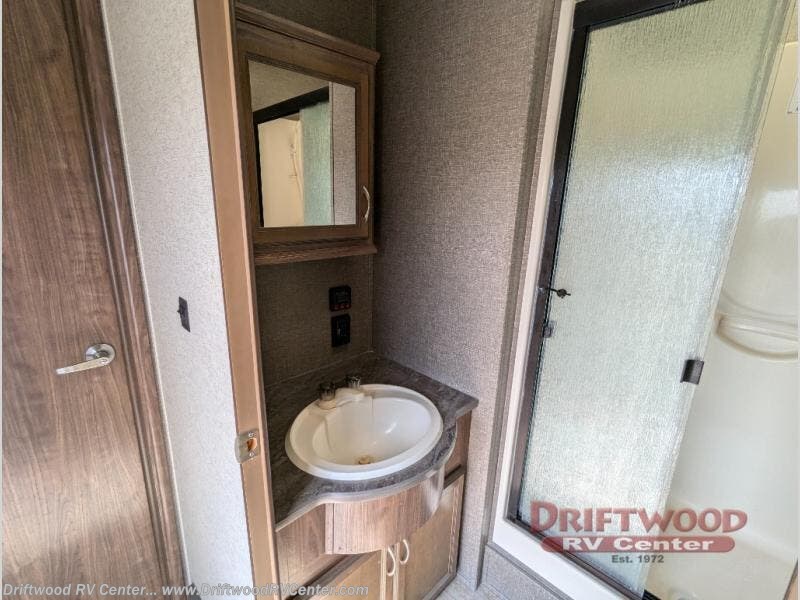 There is a slide opposite the door that features a dining table with four chairs, and a hide-a-bed sofa with overhead storage as well. An entertainment center nearby can easily be viewed by any seating in the room. Add a flat screen TV if you like.