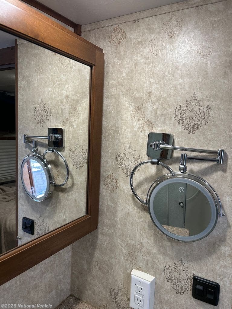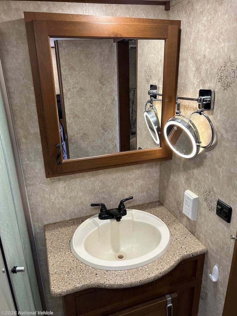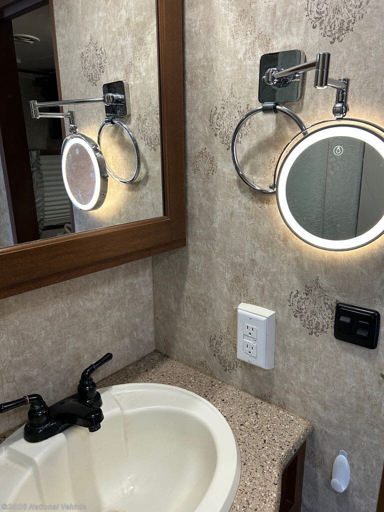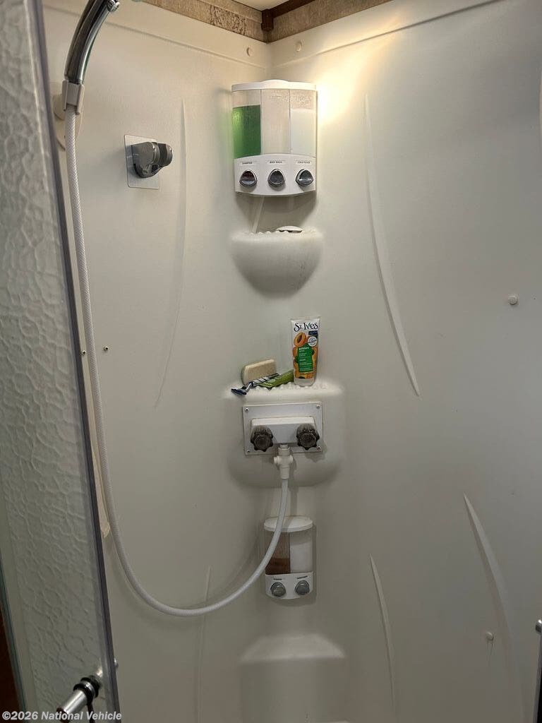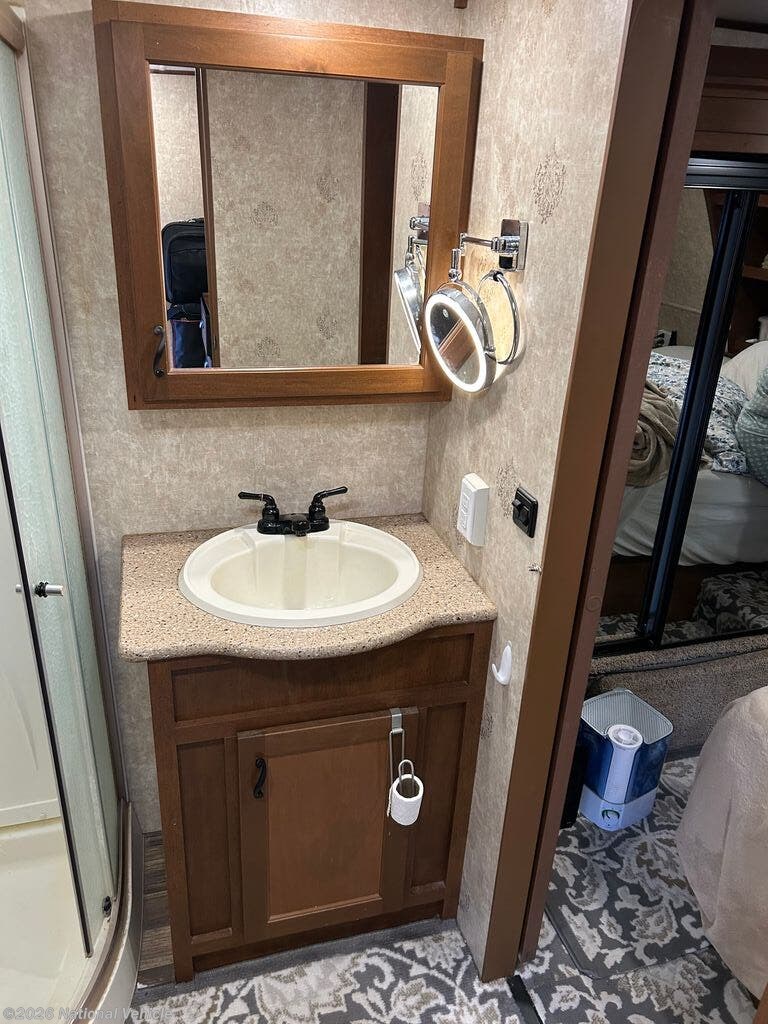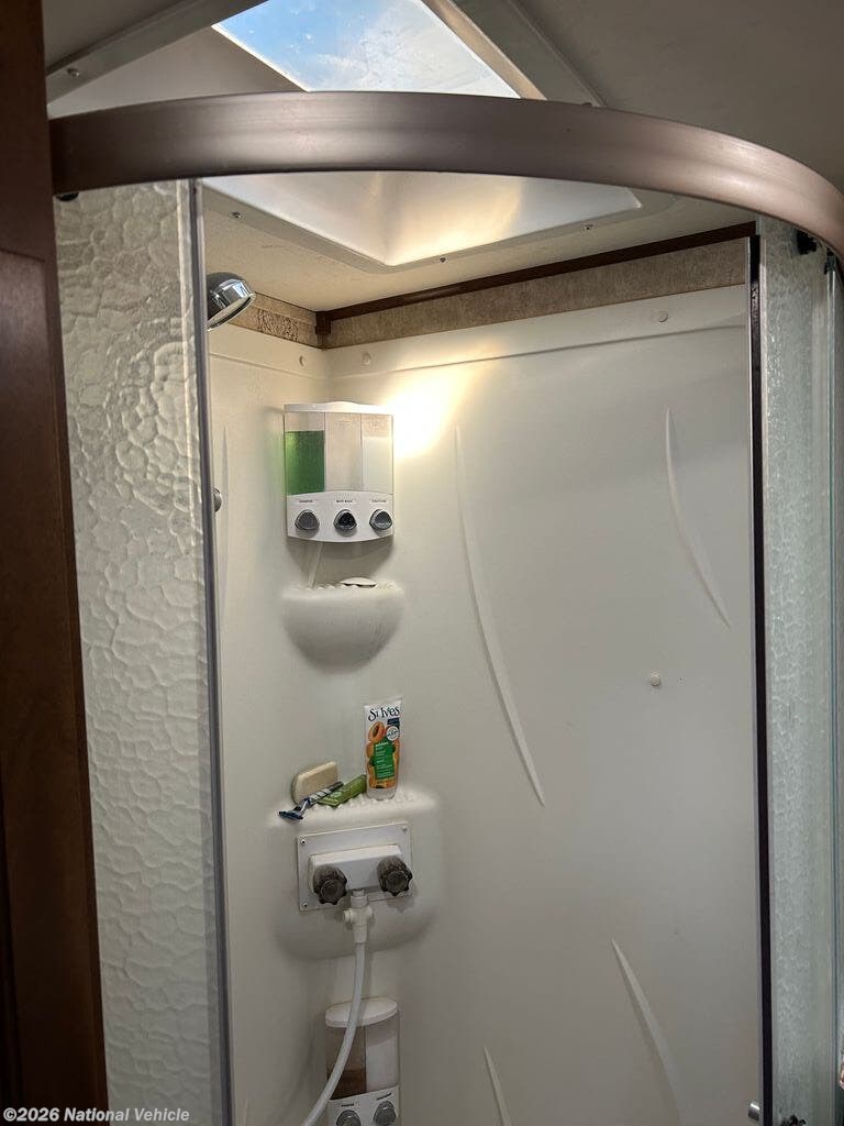 The kitchen is a highlight, offering both style and functionality. You?ll love the solid-surface Corian countertops, providing a residential feel with plenty of prep space. Full cooking amenities include a stove, oven, microwave, and ample storage for extended trips. The large refrigerator/freezer gives you all the room you need for groceries and travel essentials.