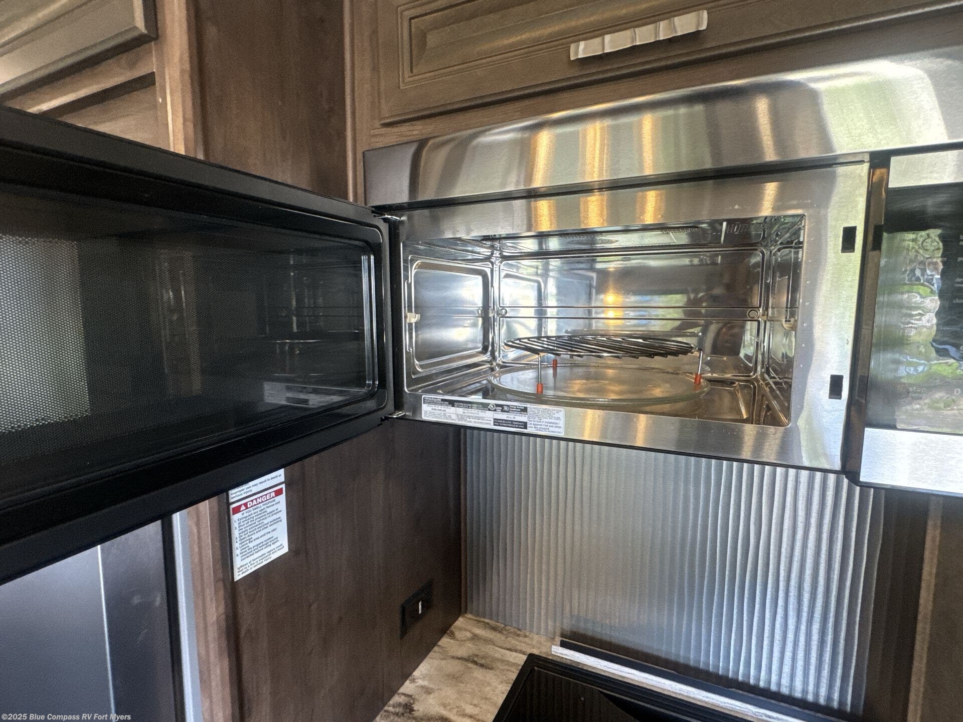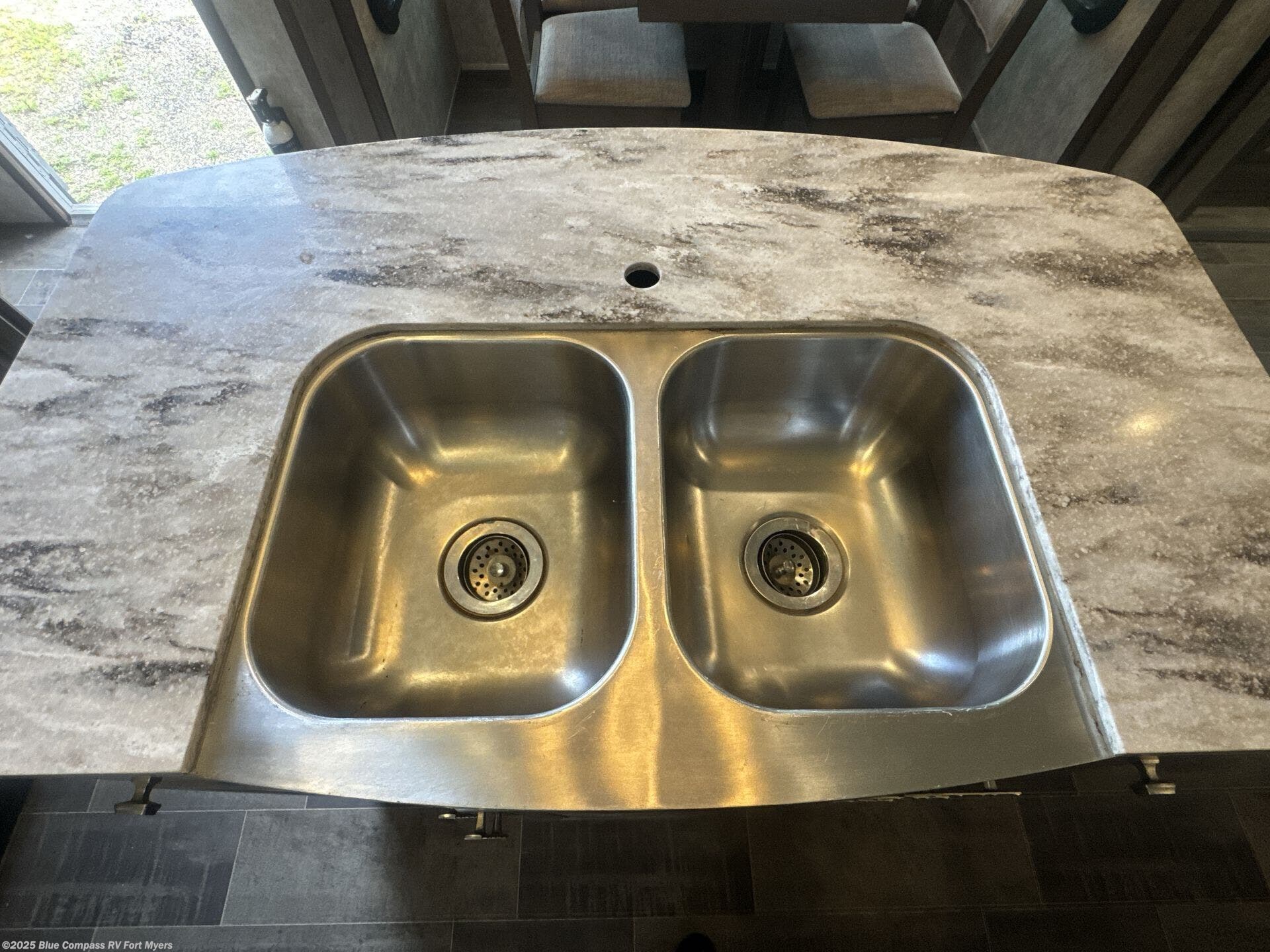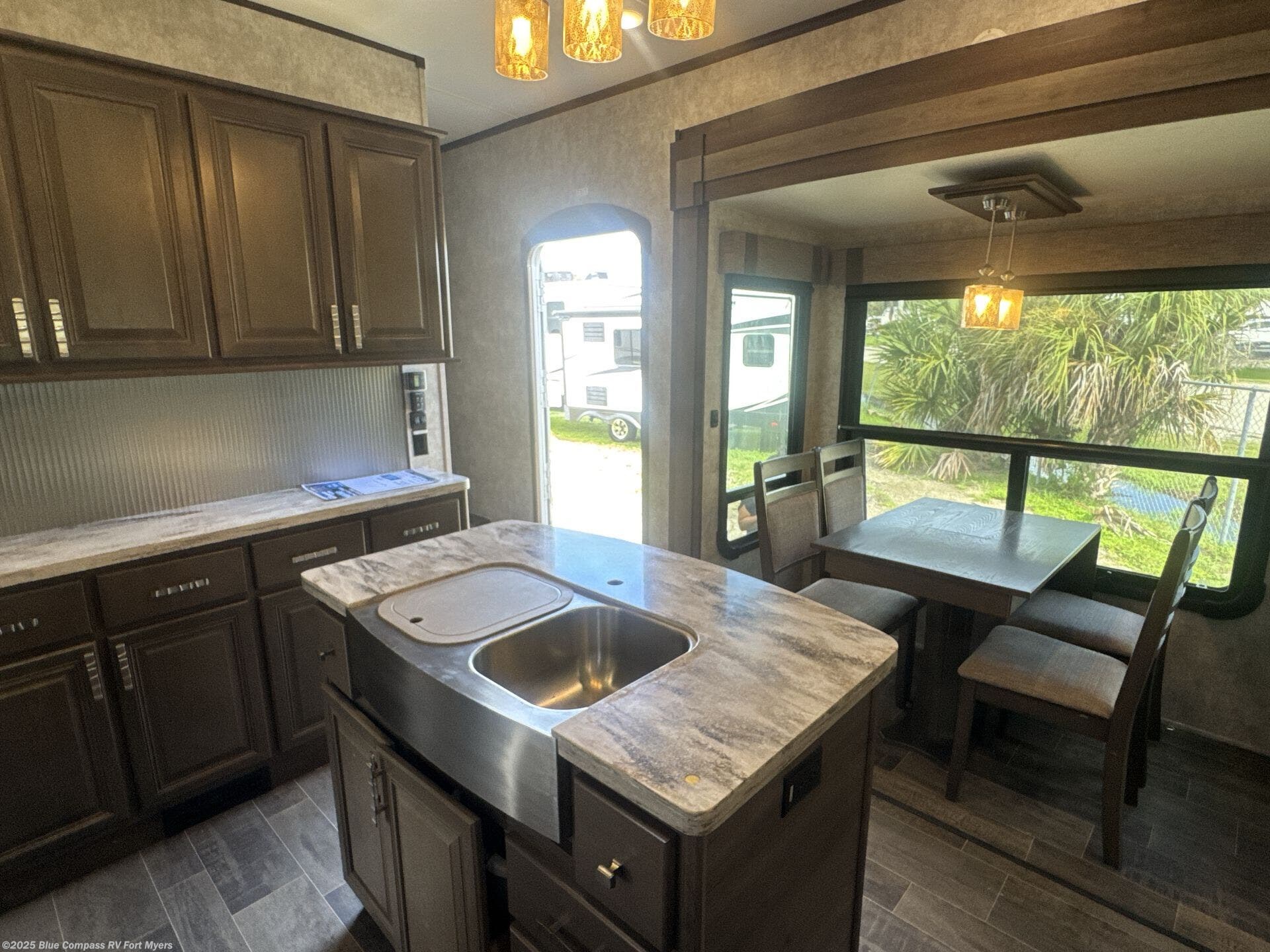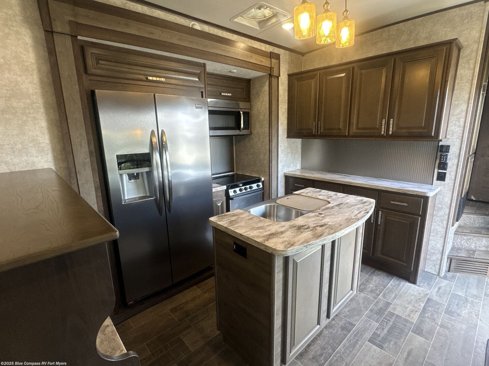 Head back to the kitchen to find a island with double sinks and counter space between two slide outs. The first slide out along the curb side wall includes a free standing dinette with chairs. On the opposite side the second slide features a three burner range, convection microwave, refrigerator, and a pantry for your dry goods. There is additional counter space along a short interior wall, and additional countertop plus overhead storage on the other interior wall in the kitchen.
