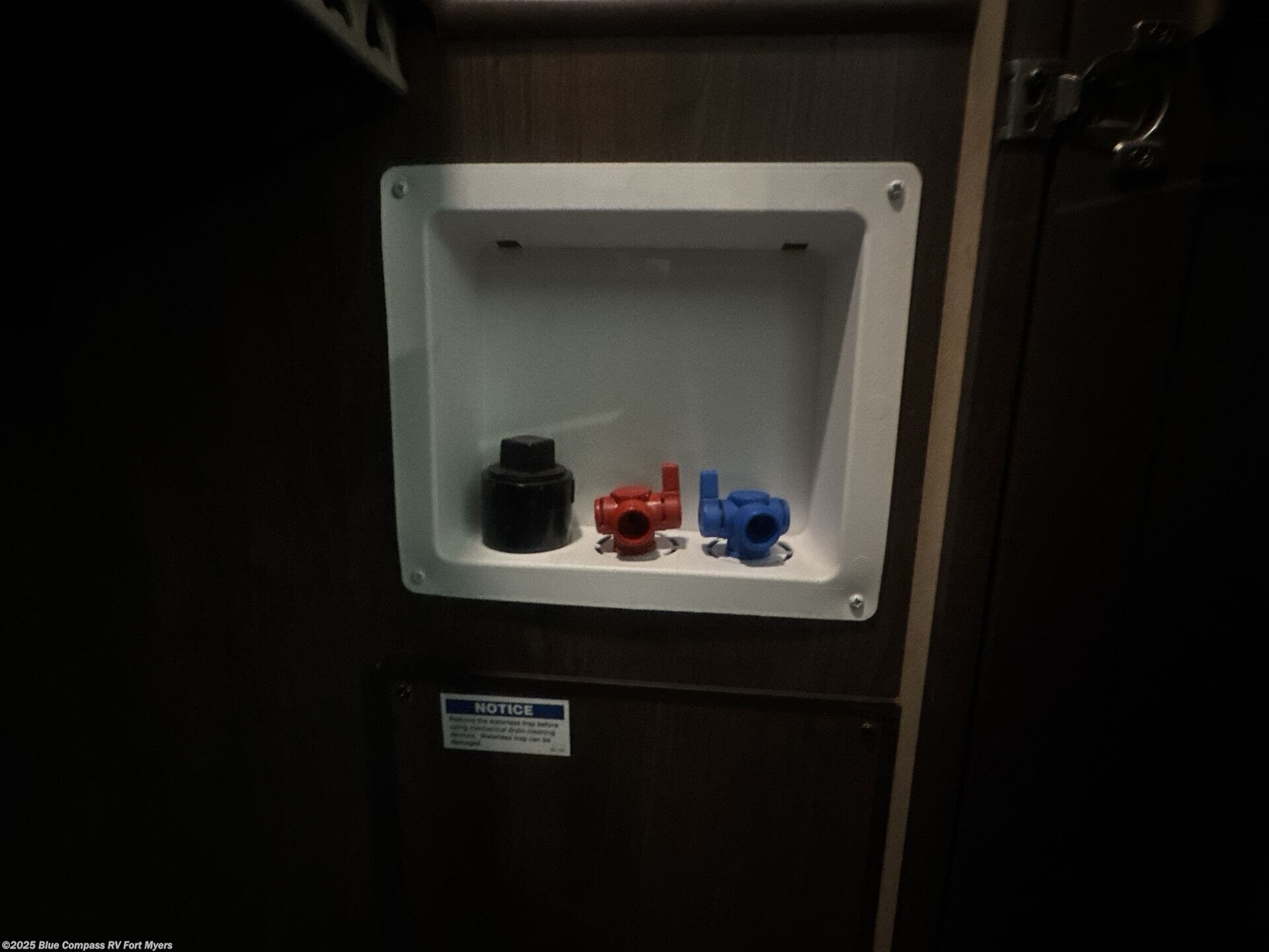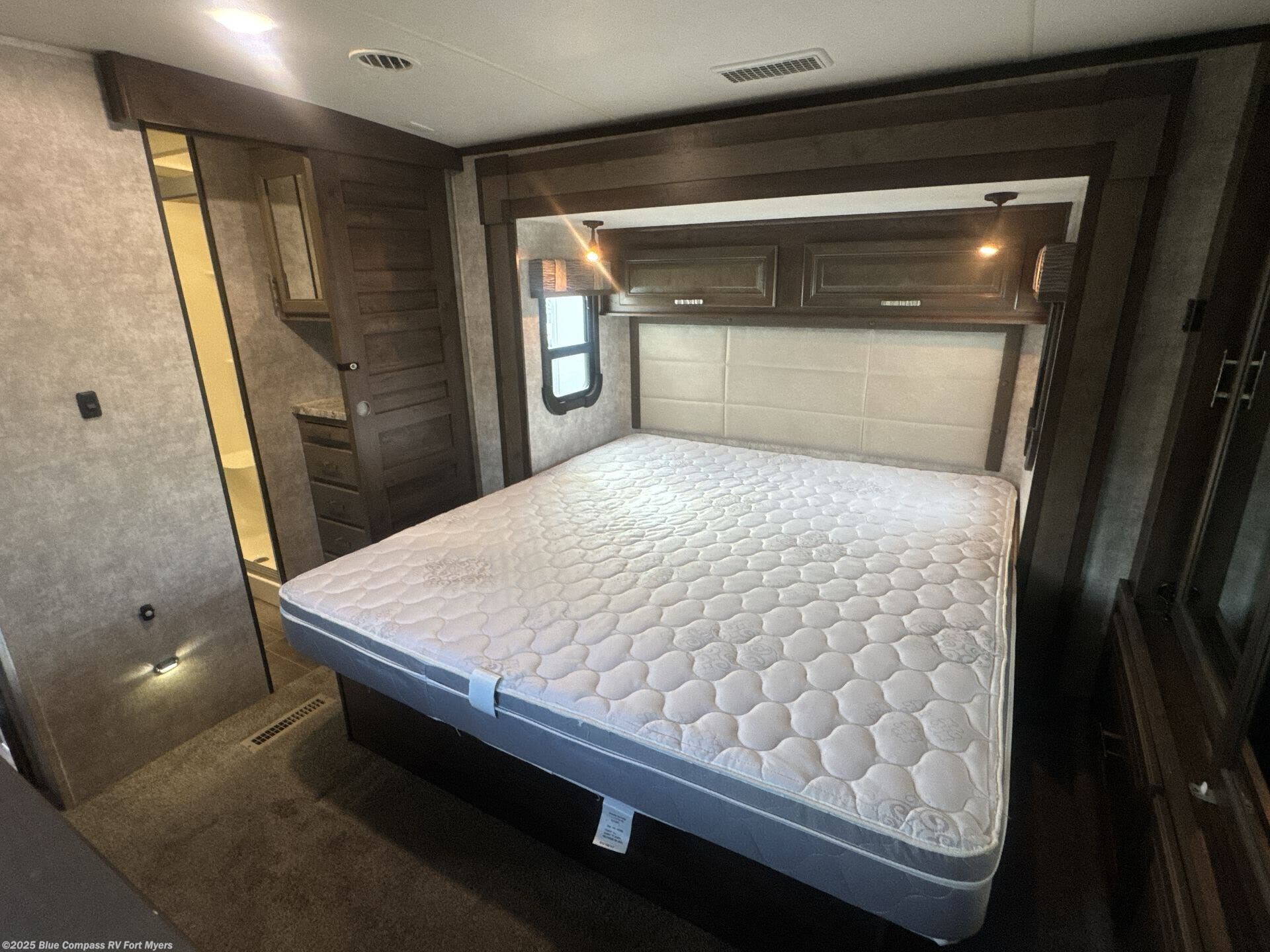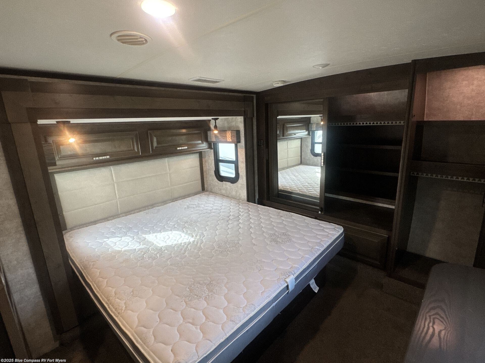 The bedroom also has an entry at the head of the hall. Inside find a king size bed slide out with nightstands on either side, a chest of drawers with optional TV above, and a front wall wardrobe with sliding mirrored doors, plus a closet that has been prepped with a washer and dryer for added convenience.