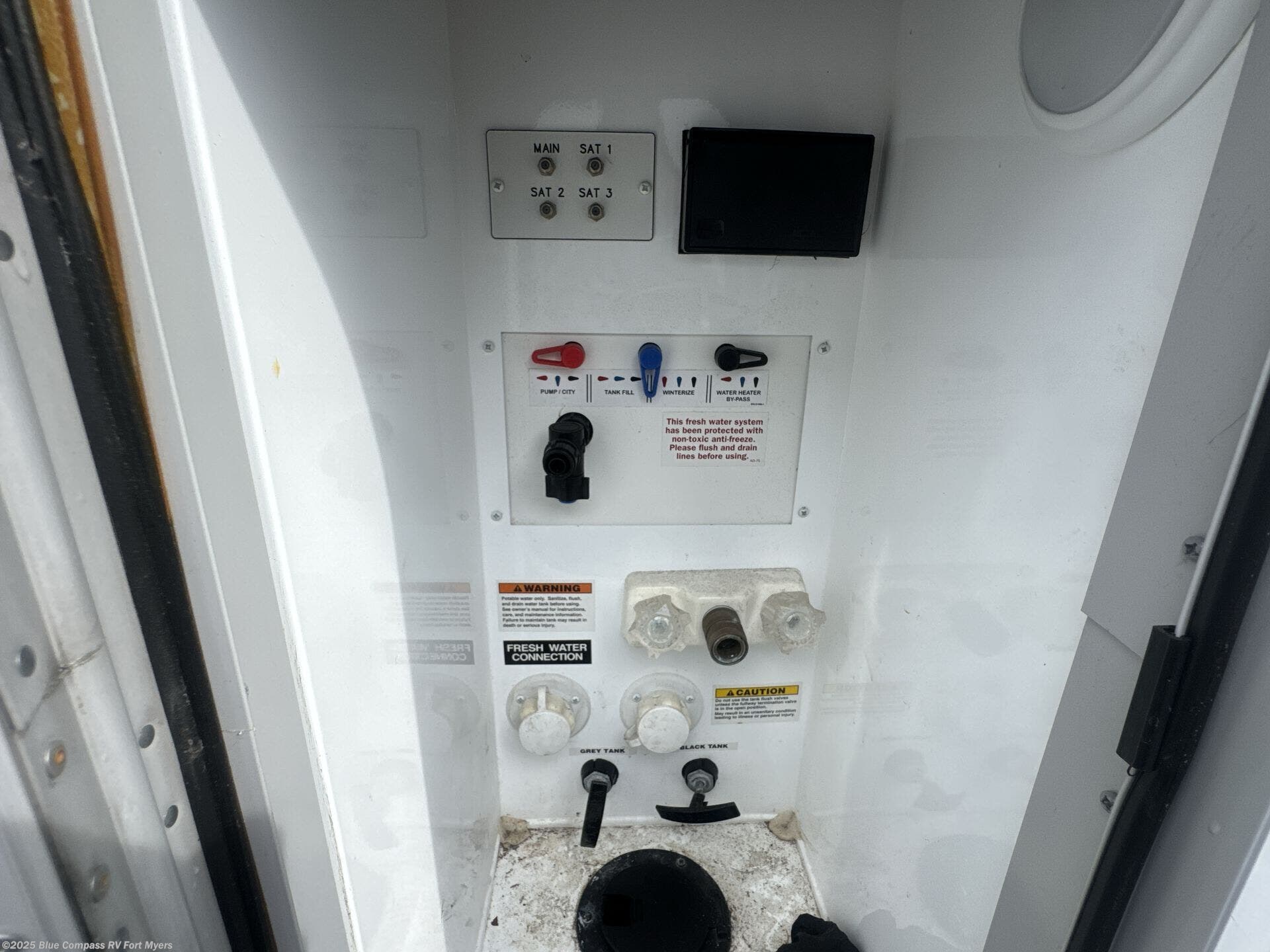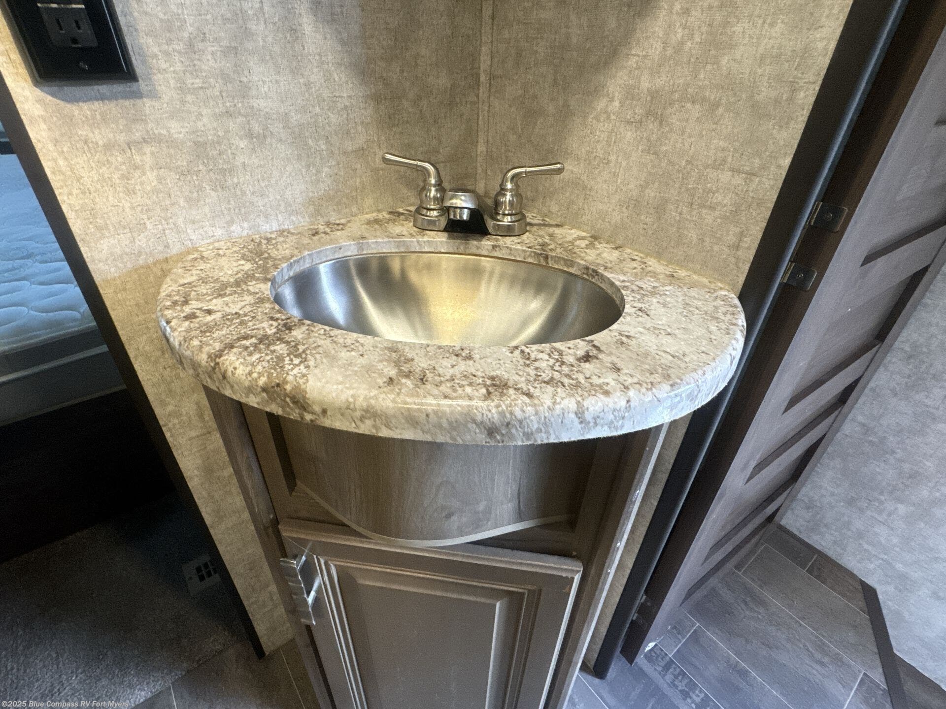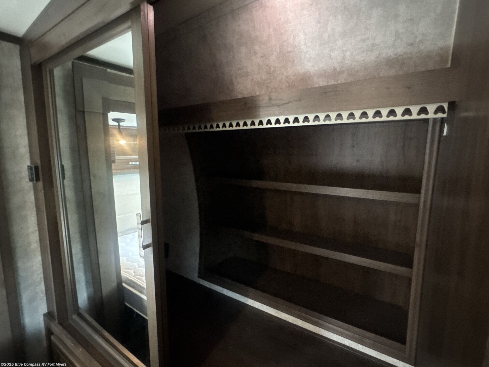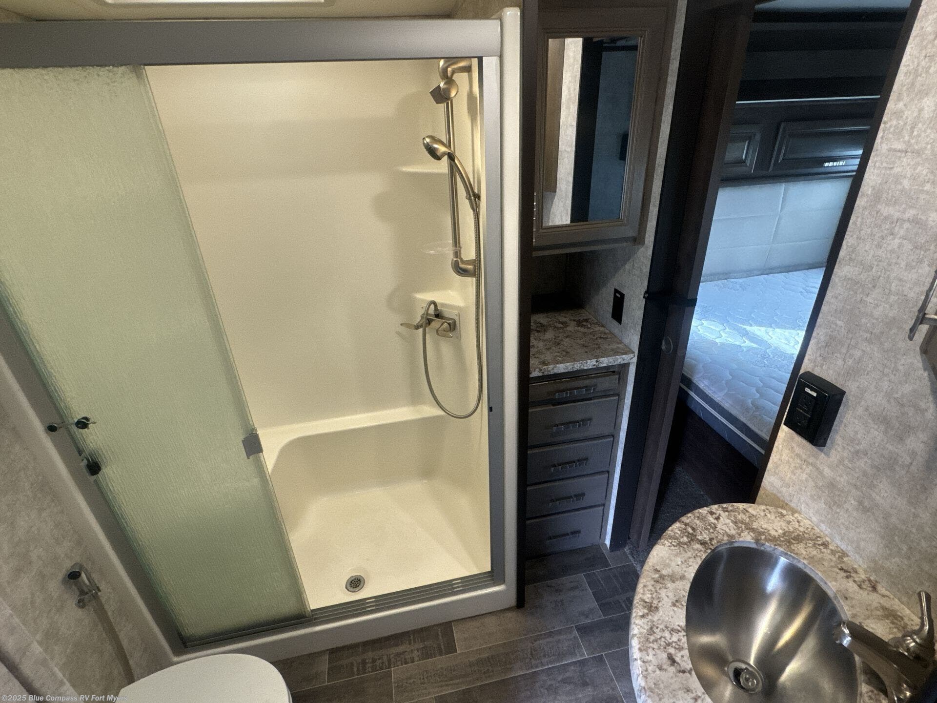 The bedroom also has an entry at the head of the hall. Inside find a king size bed slide out with nightstands on either side, a chest of drawers with optional TV above, and a front wall wardrobe with sliding mirrored doors, plus a closet that has been prepped with a washer and dryer for added convenience.