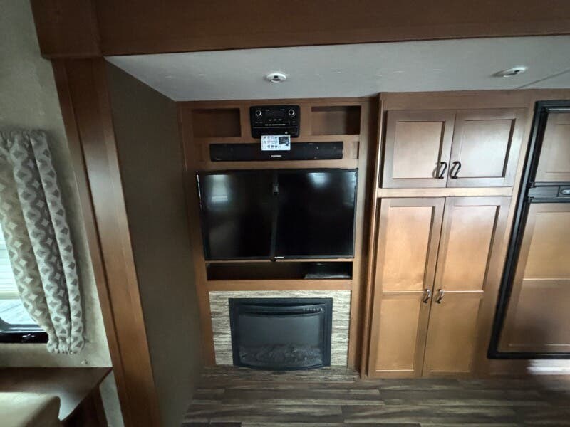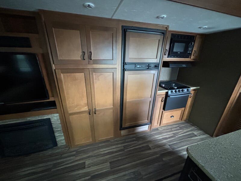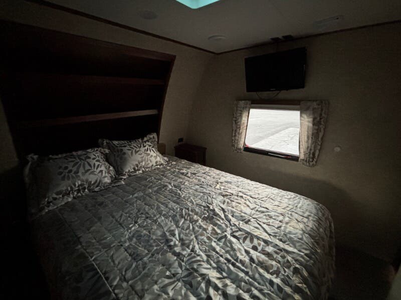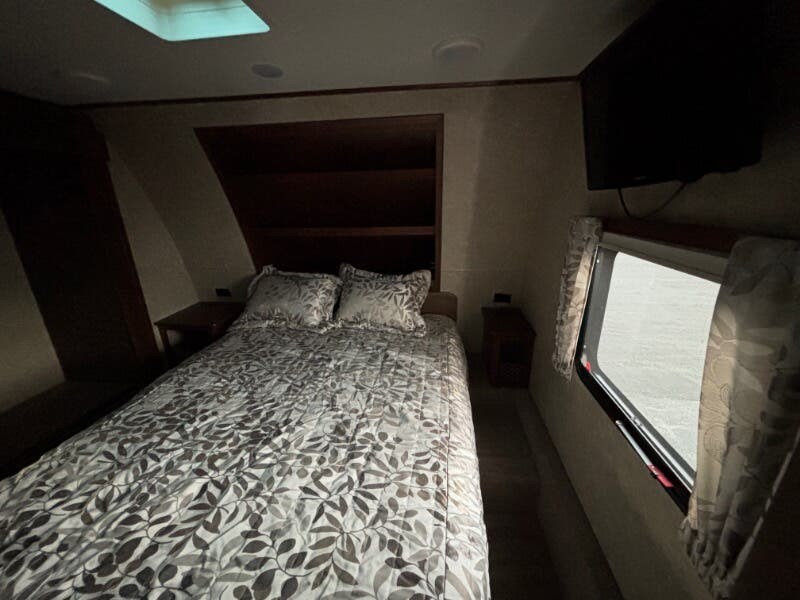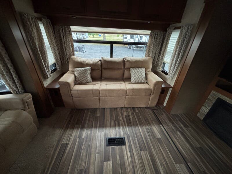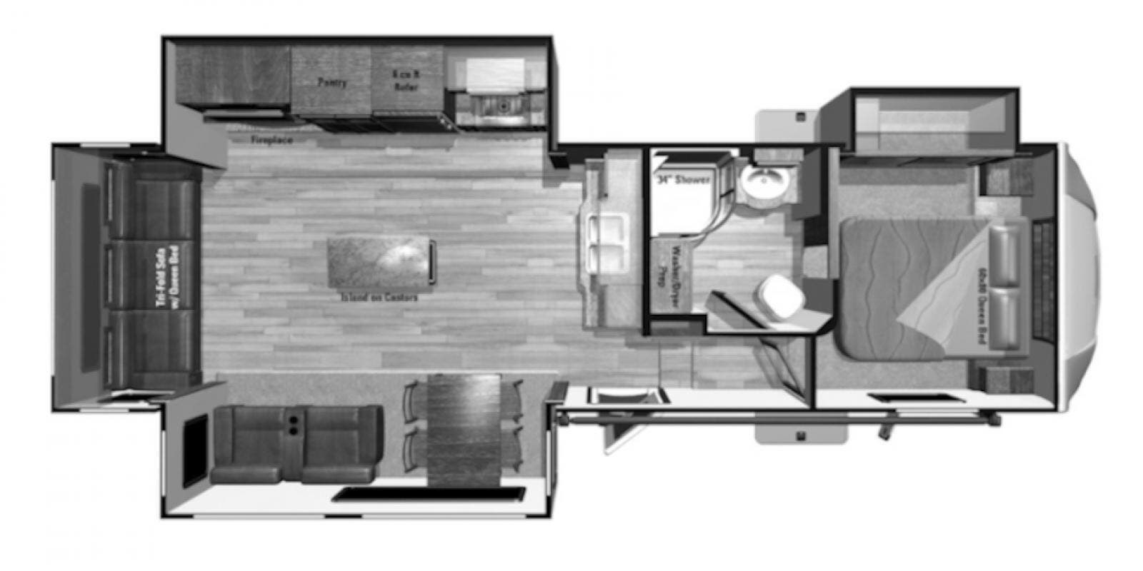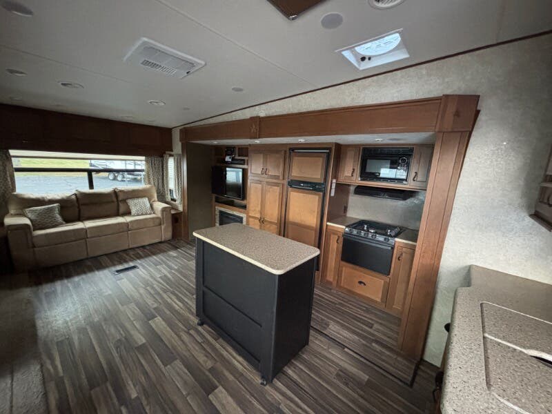Features Include: Awning LED Light, LED Ceiling Lighting, Digital Thermostat, Frameless Windows, Pleated Night Shades, Entertainment Center, Tri-Fold Sofa Bed, Maxx Air Vent Cover, Overhead Cabinets, Pantry, Stainless Steel Sink, High-Rise Faucet, Cooktop, Microwave Oven, MaxxAir MAXXFAN PLUS, Systems Center, Backup Camera Prep, 39-inch LED TV, Queen Bed, Nightstands, Wardrobe, Medicine Cabinet, Vanity Sink, Linen Storage, Shower, Toilet Mechanicals, 60# LP Capacity, 50-Amp Service Cord, 2nd AC Prep, Foam AC Ductwork, King Combo Pin Box, Steel I-BeamFrame, Aluminum Wheels, Aluminum Structure, 5-inch Roof Truss, Roof, Walk-on PVC Roofing, Heated Storage Area, Power Front Jacks