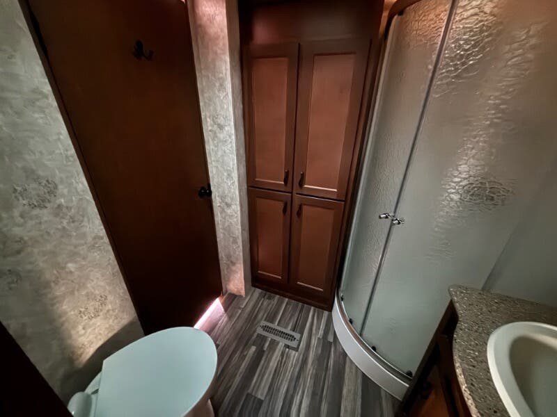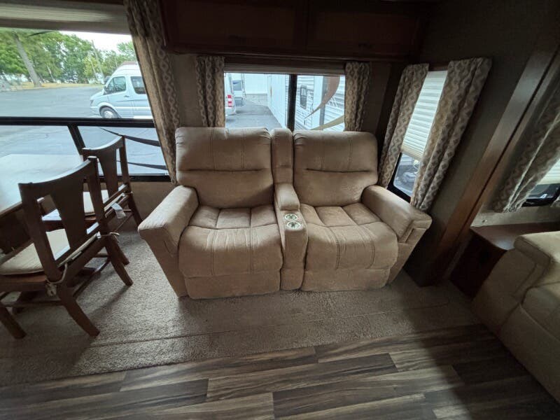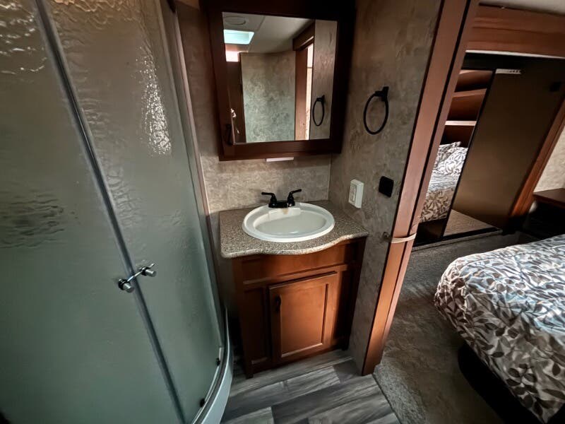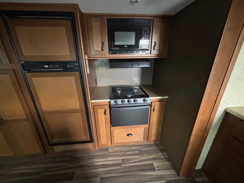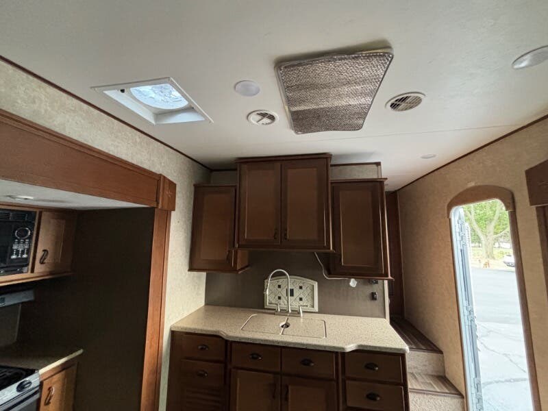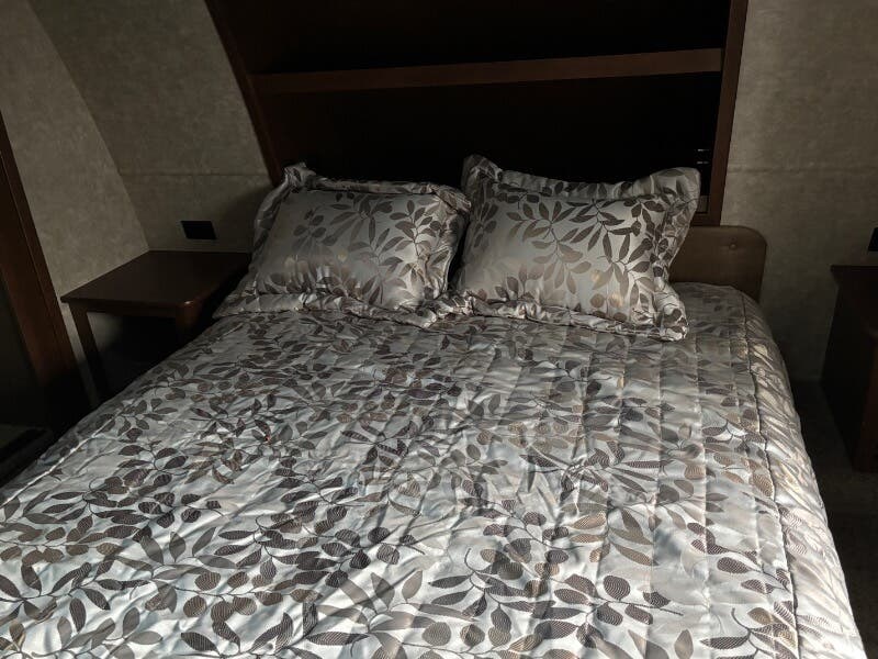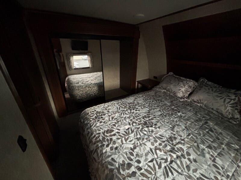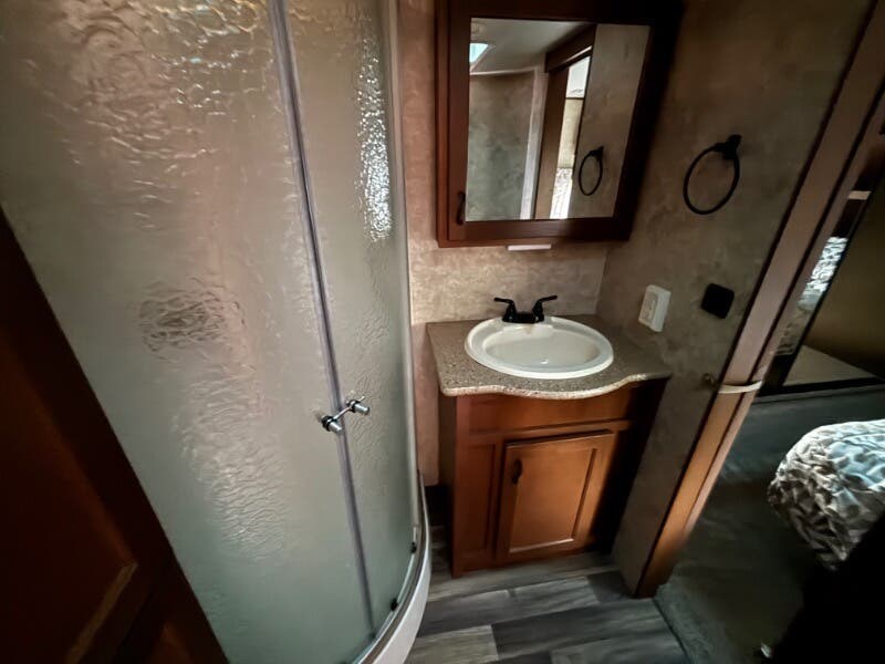 Features Include: Awning LED Light, LED Ceiling Lighting, Digital Thermostat, Frameless Windows, Pleated Night Shades, Entertainment Center, Tri-Fold Sofa Bed, Maxx Air Vent Cover, Overhead Cabinets, Pantry, Stainless Steel Sink, High-Rise Faucet, Cooktop, Microwave Oven, MaxxAir MAXXFAN PLUS, Systems Center, Backup Camera Prep, 39-inch LED TV, Queen Bed, Nightstands, Wardrobe, Medicine Cabinet, Vanity Sink, Linen Storage, Shower, Toilet Mechanicals, 60# LP Capacity, 50-Amp Service Cord, 2nd AC Prep, Foam AC Ductwork, King Combo Pin Box, Steel I-BeamFrame, Aluminum Wheels, Aluminum Structure, 5-inch Roof Truss, Roof, Walk-on PVC Roofing, Heated Storage Area, Power Front Jacks