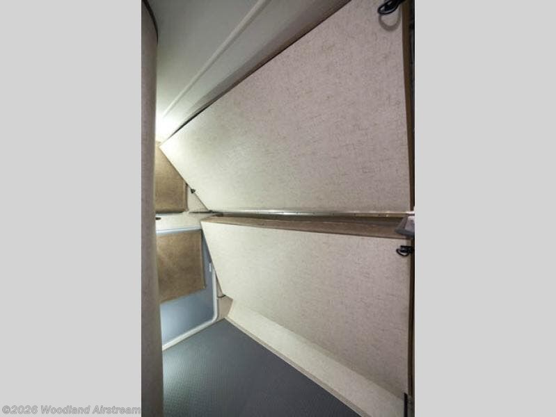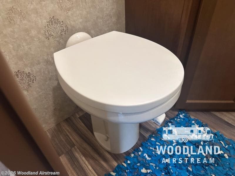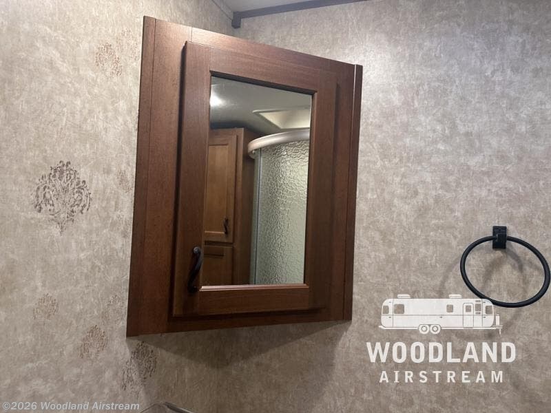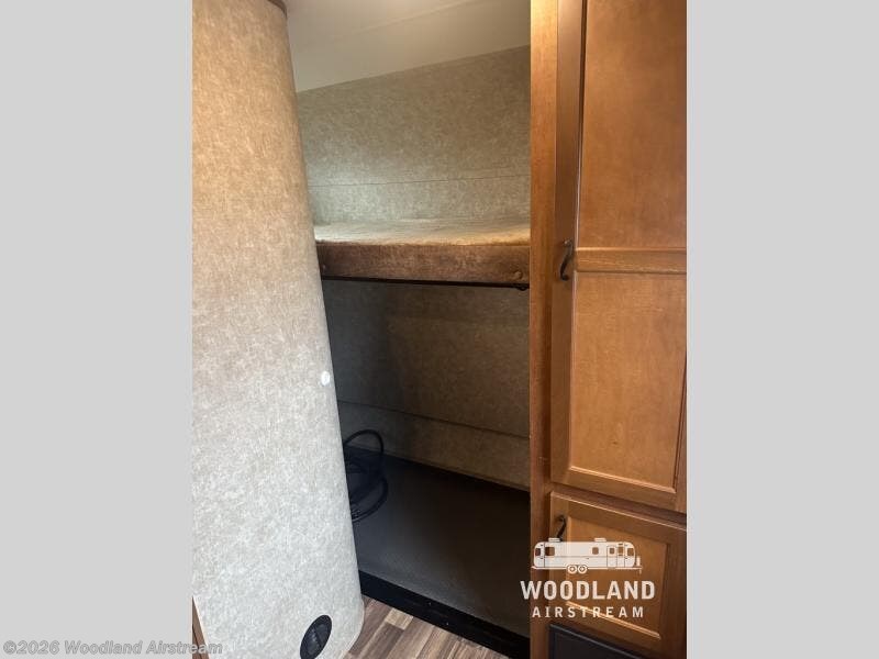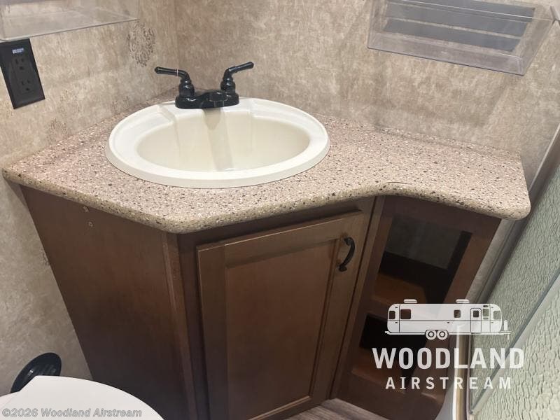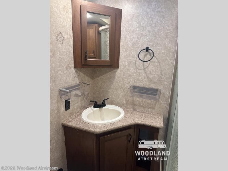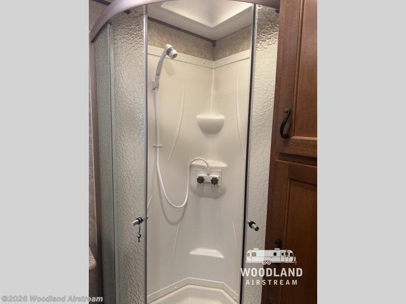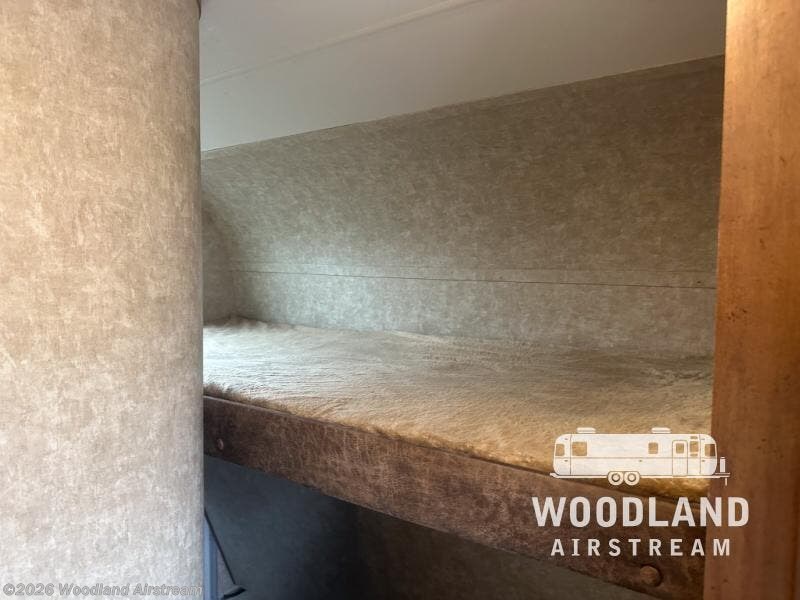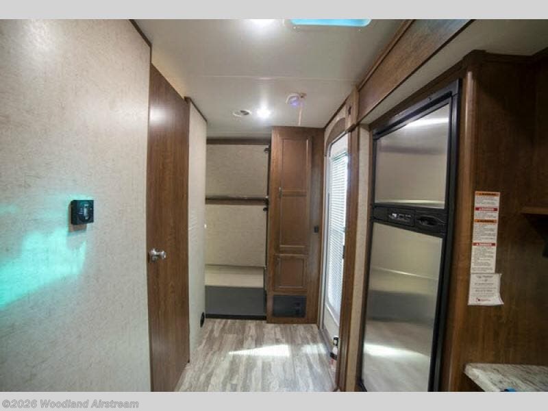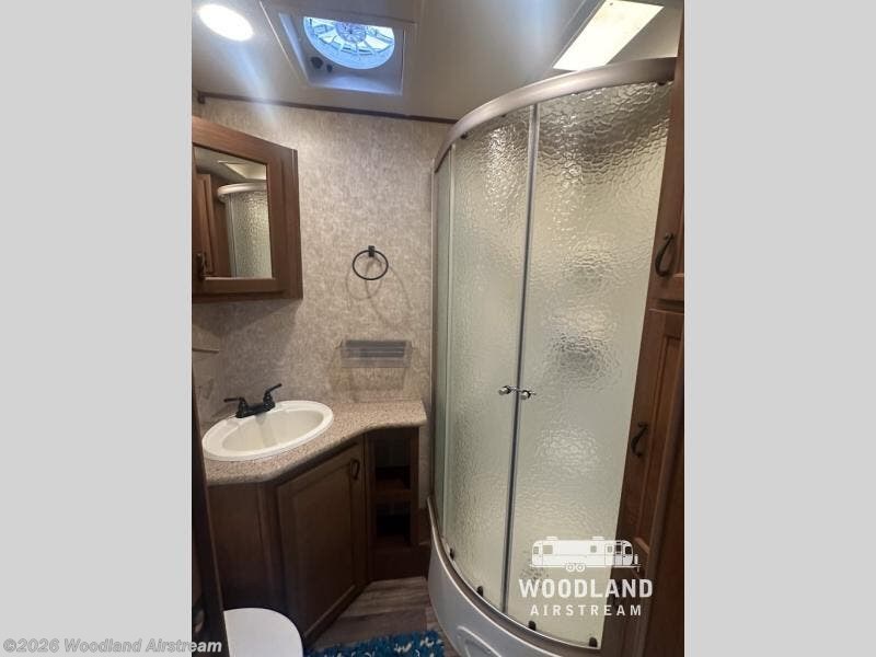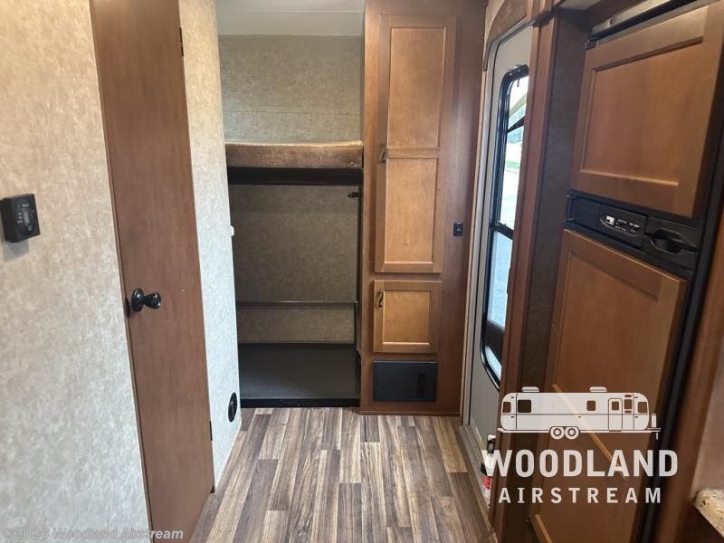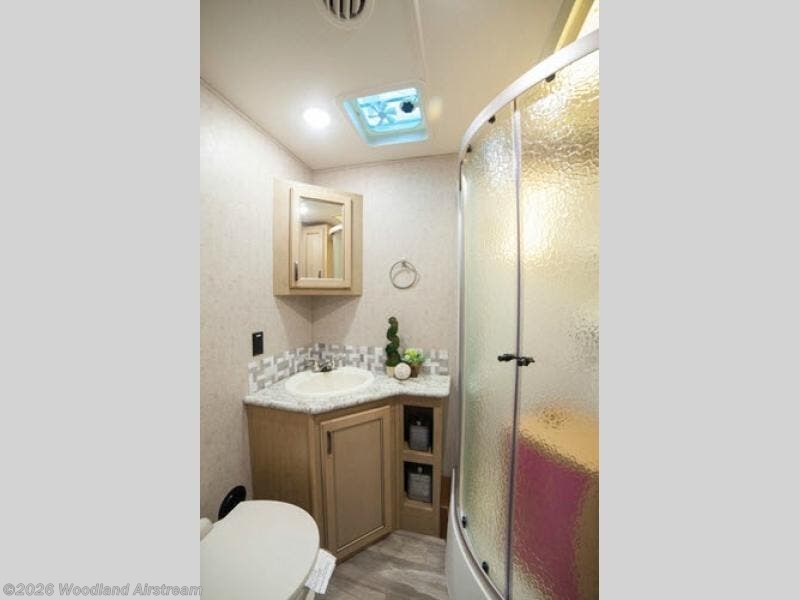 Step inside to the right to see a set of bunks with cabinets next to the entry door, plus an exterior storage door. Next, a convenient full bath includes a radius shower, toilet, linen storage, and vanity with sink.