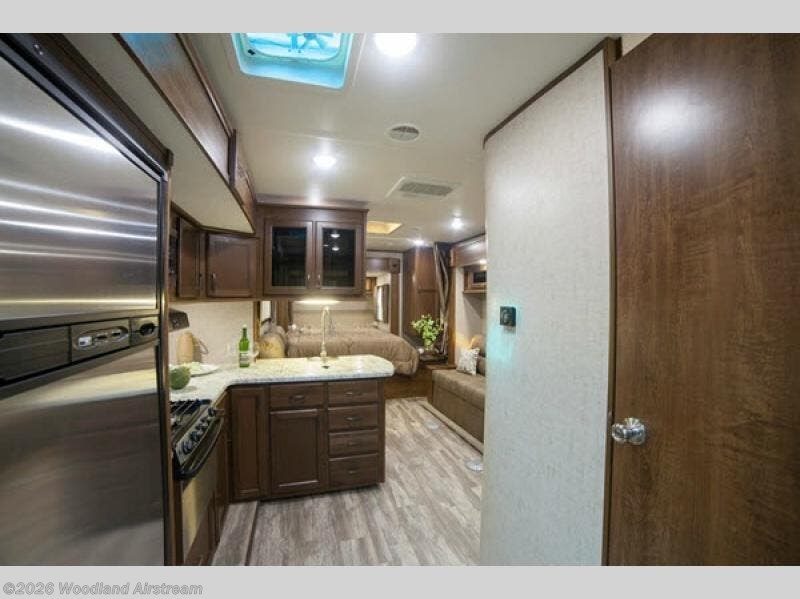 The first slide out in the combined kitchen and living area includes a refrigerator, three burner range, microwave, overhead cabinets, and counter space for preparing meals. Plus there is a l-shaped counter with a double kitchen sink. Continuing along the curb side wall, there is a sofa with storage below. On the opposite wall you will find a slide out jack-knife sofa with two tables, and an entertainment center is adjacent.