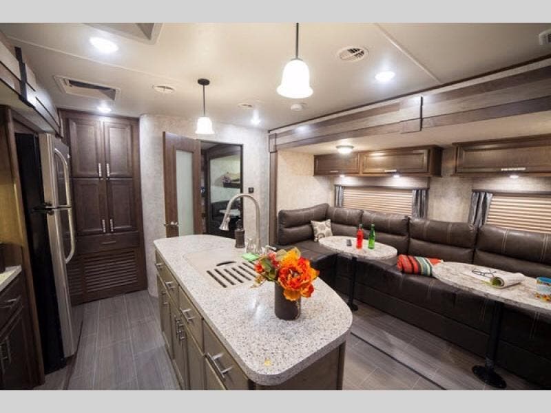 There are two handy cabinets on your right when entering. Continue into the room and around the corner to view a convenient entertainment center with optional wall-mounted fireplace below. There is a large slide out U-shaped lounge, two tables and overhead storage along the road side wall. The lounge can be made into a bed easily. There is also a center island with dual sinks for easy food prep and cleanup also.
