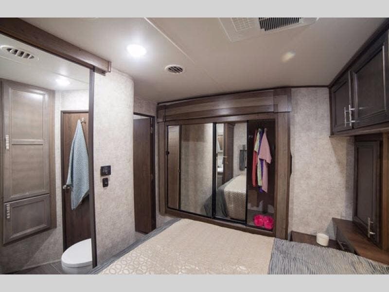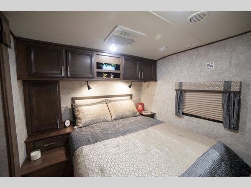 The front bedroom features a slide out mirrored door wardrobe, plus a queen bed with nightstands and overhead storage.