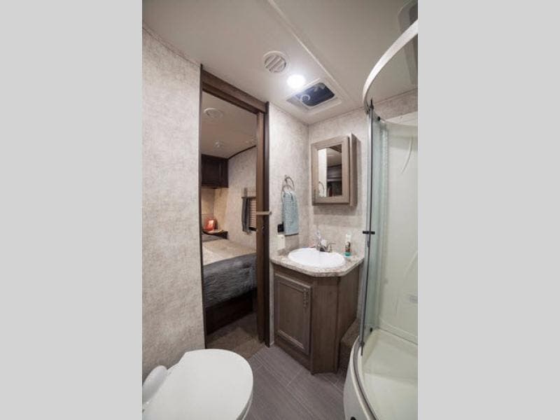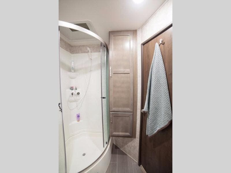 The front of this Roamer RT310BHS model features a side aisle bath with an radius shower, toilet, sink, and a corner linen cabinet.