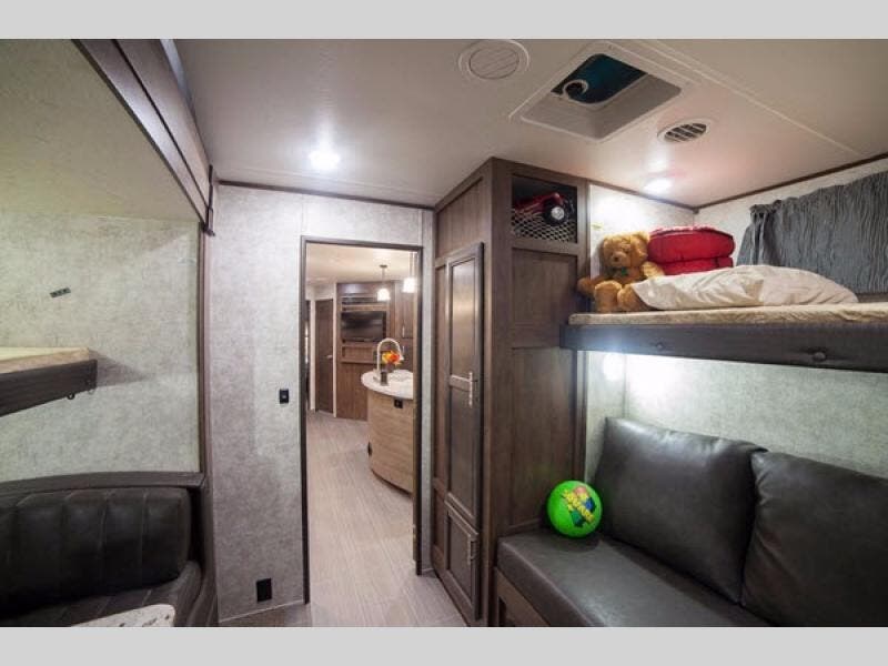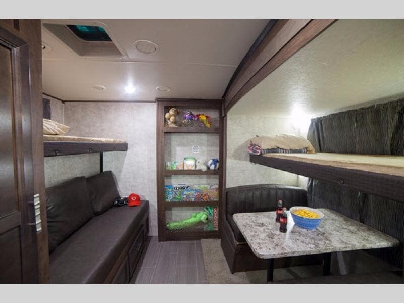 The private rear bunkhouse is a great place for the kids or guests to call their own. They can sleep comfortably on the sofa with bunk above on the left or opposite in the slide out dinette below an upper bunk. They may also enjoy playing games on the dinette and relaxing on the sofa while watching the optional TV along the rear wall, plus they have a place to stow their toys in the netted storage shelves. There is a wardrobe with shelf above next to the sofa to store their camping clothes.