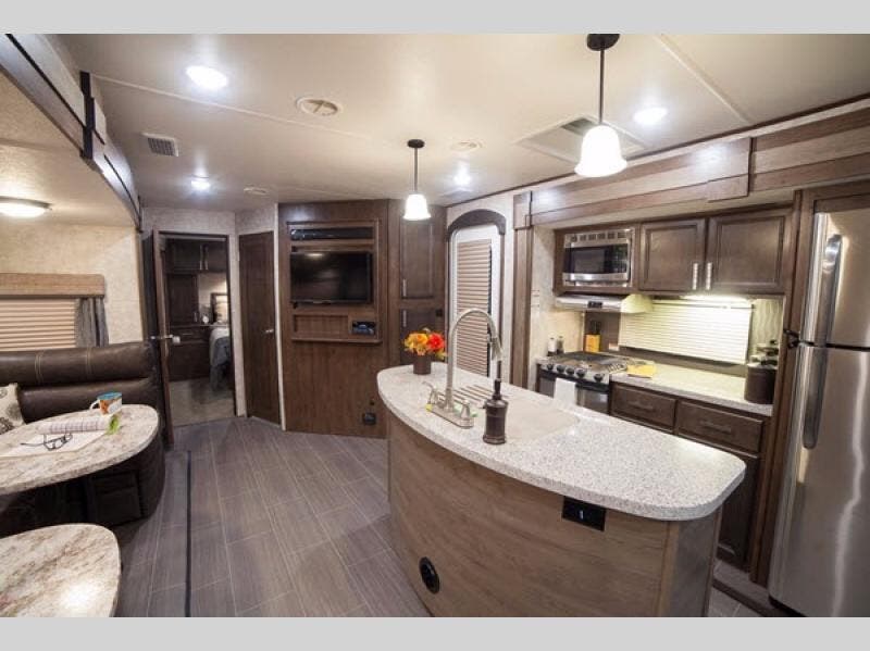 Step inside and see how spacious the interior is with the dual living and kitchen area slides opposite one another fully extended. There is a refrigerator, three burner range, and microwave slide to your immediate left just inside the main entry door. There is also a pantry off to the side for your dry goods and snacks.