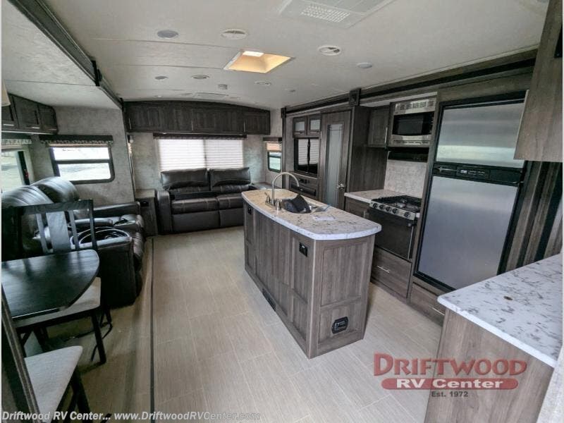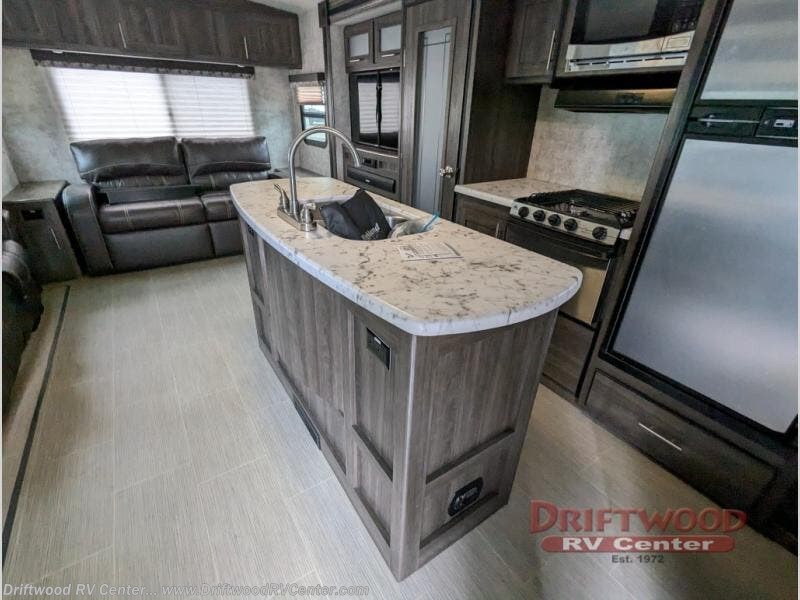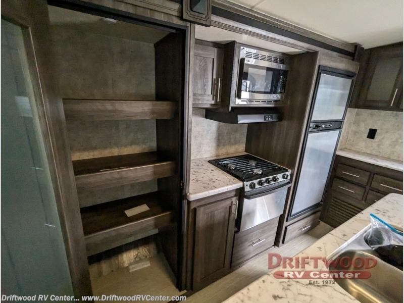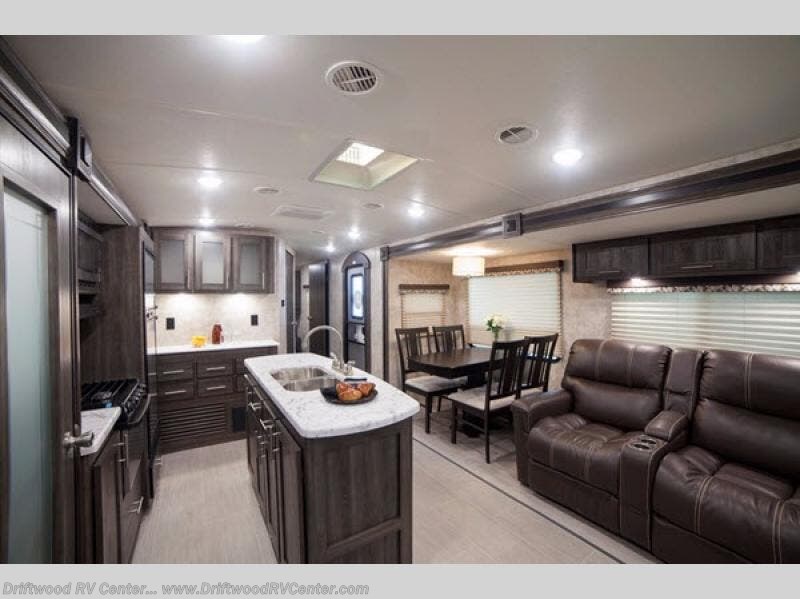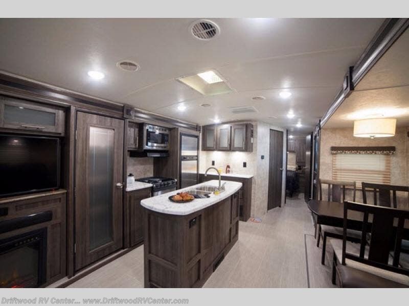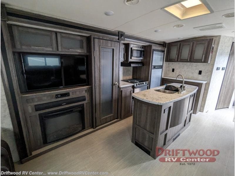 Step inside to your right to find a slide out including a dinette, and theater seating for two. On the opposite side there is a second slide featuring the entertainment center with fireplace and kitchen amenities. The kitchen features everything you need to cook up light meals and snacks while you are away. There is a refrigerator for your perishables, a three burner range, microwave, and a large pantry for your dry goods. You will also find plenty of storage cabinets both above and below the counter. A center island provides more countertop space and a double sink for easy clean up. Plus there is additional counter space, cabinets, and drawers along the interior wall. This a dream kitchen for the chef in the family.