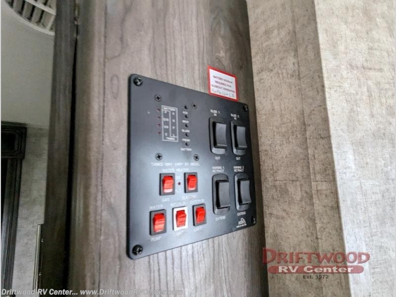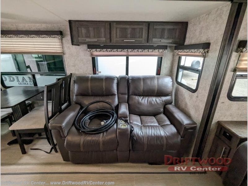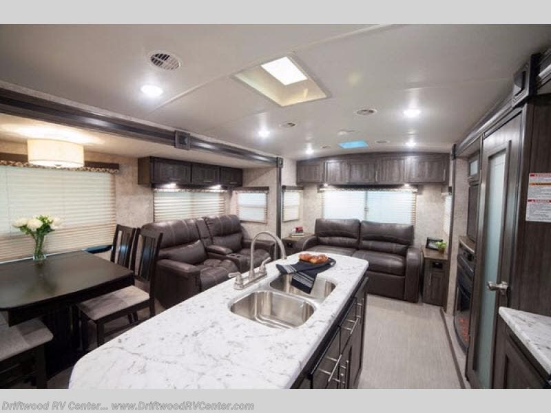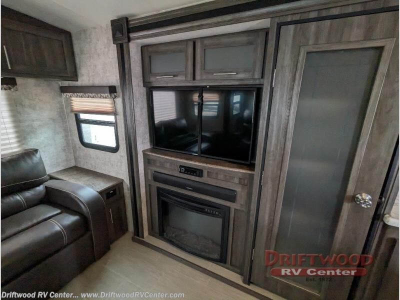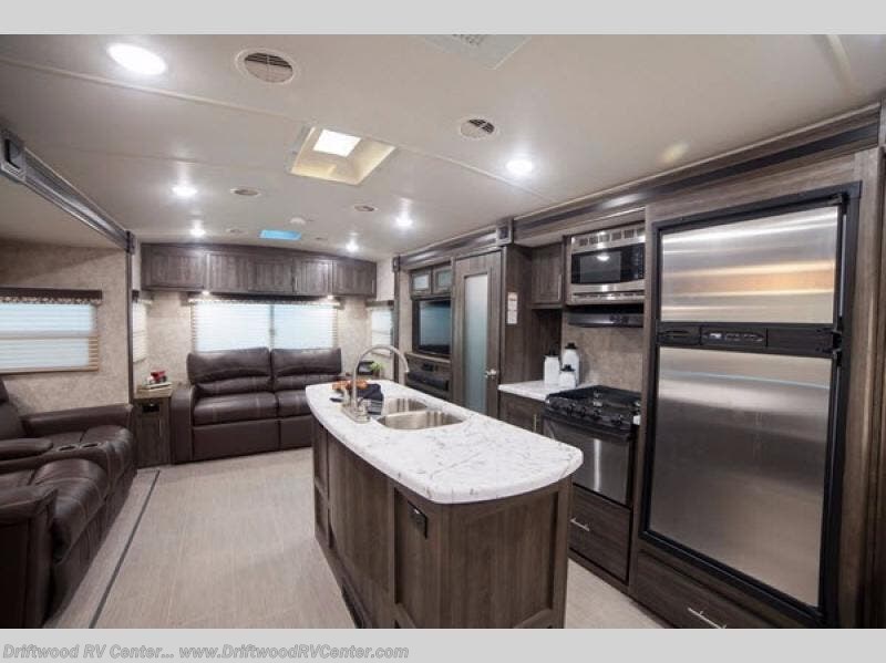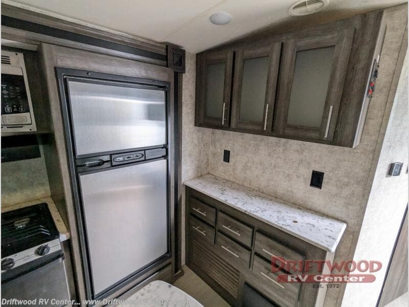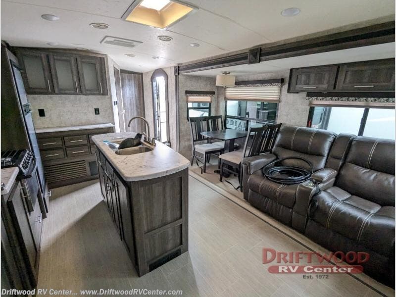 Step inside to your right to find a slide out including a dinette, and theater seating for two. On the opposite side there is a second slide featuring the entertainment center with fireplace and kitchen amenities. The kitchen features everything you need to cook up light meals and snacks while you are away. There is a refrigerator for your perishables, a three burner range, microwave, and a large pantry for your dry goods. You will also find plenty of storage cabinets both above and below the counter. A center island provides more countertop space and a double sink for easy clean up. Plus there is additional counter space, cabinets, and drawers along the interior wall. This a dream kitchen for the chef in the family.
