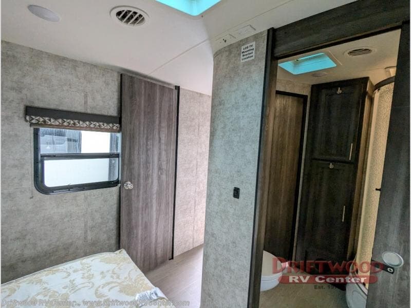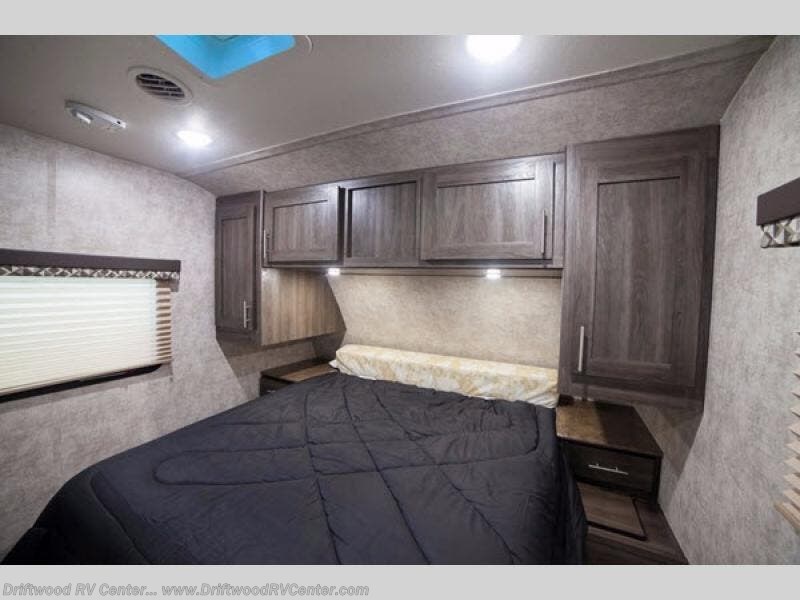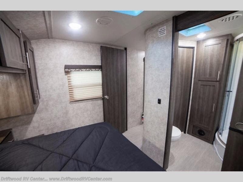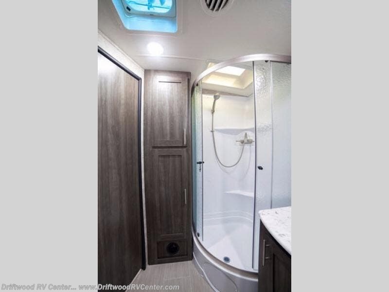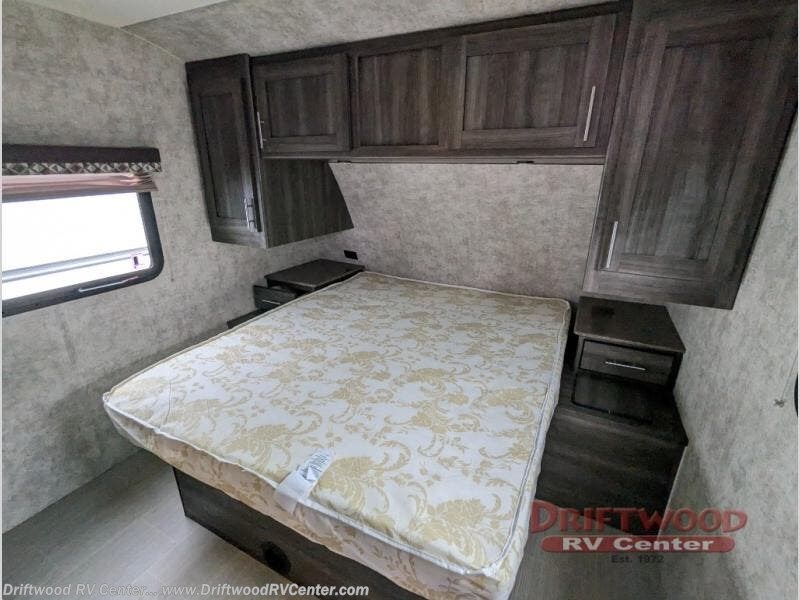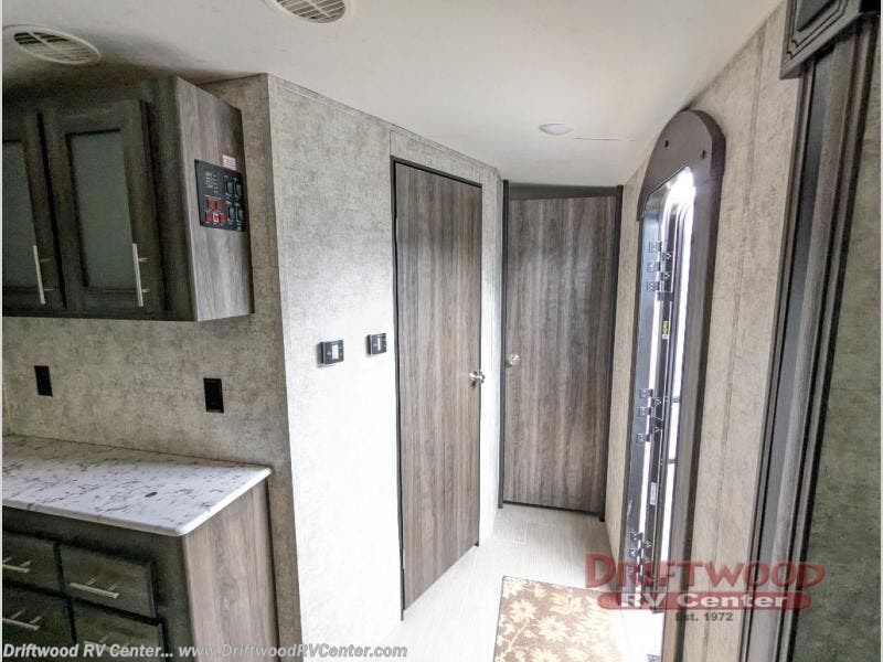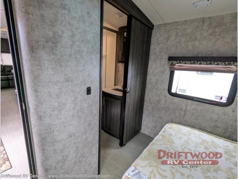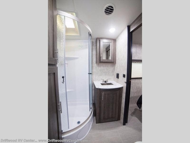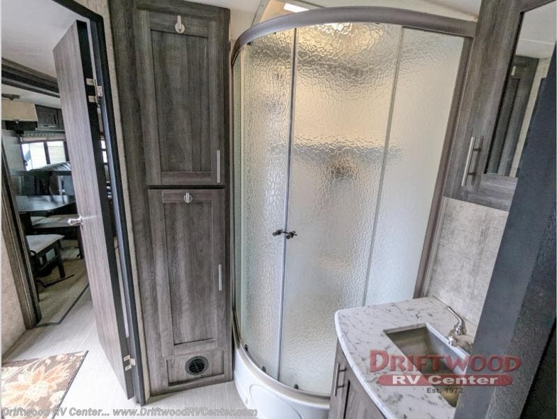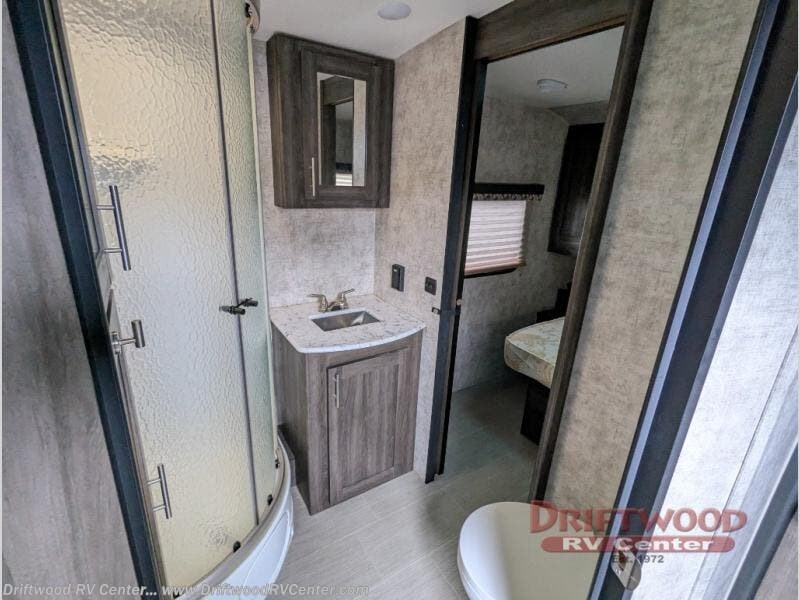 Continuing towards the front of this Open Range Ultra Lite you will find a bathroom on your left. Inside enjoy a radius shower, toilet, sink, and linen storage. A second sliding door leads directly into the front master bedroom providing dual entry into the bathroom and into the bedroom.