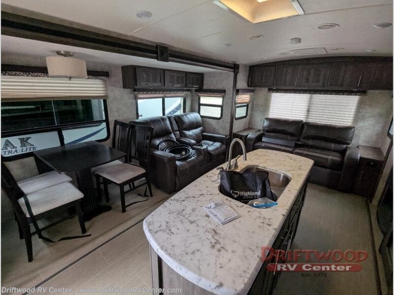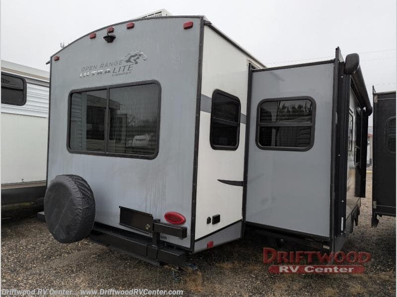 This rear living Open Range Ultra Lite travel trailer by Highland Ridge RV offers a convenient way to spend time at any camp site. Model UT2910RL features dual opposing slides in the main living and kitchen area which increases the interior walking around space, and a handy kitchen island, plus more!