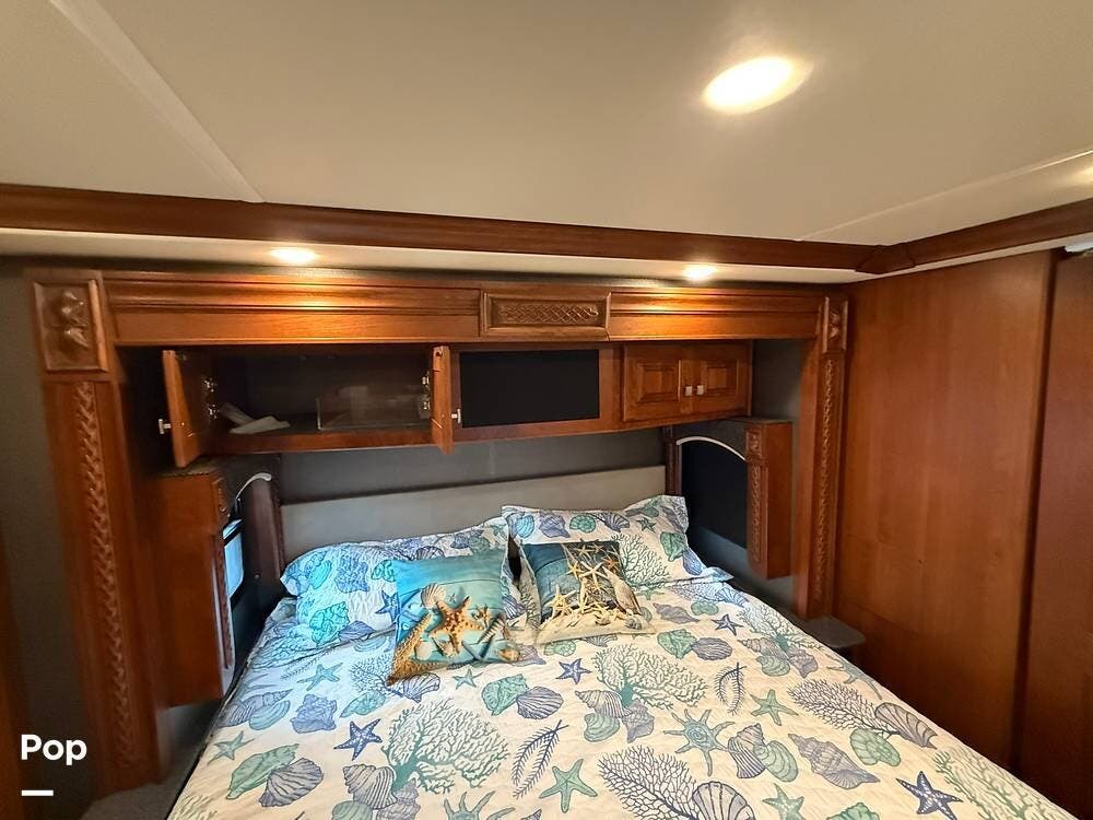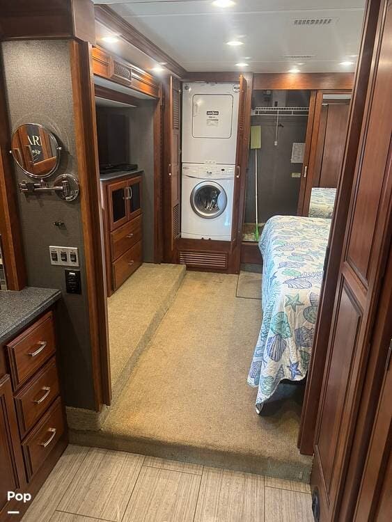 This unit seamlessly flows into the rear bedroom, featuring sliding doors for added privacy. The bedroom is carpeted and features a cedar-lined closet, as well as a full-size washer and dryer. The king bed, complete with storage below and a TV, makes for a comfortable space.
