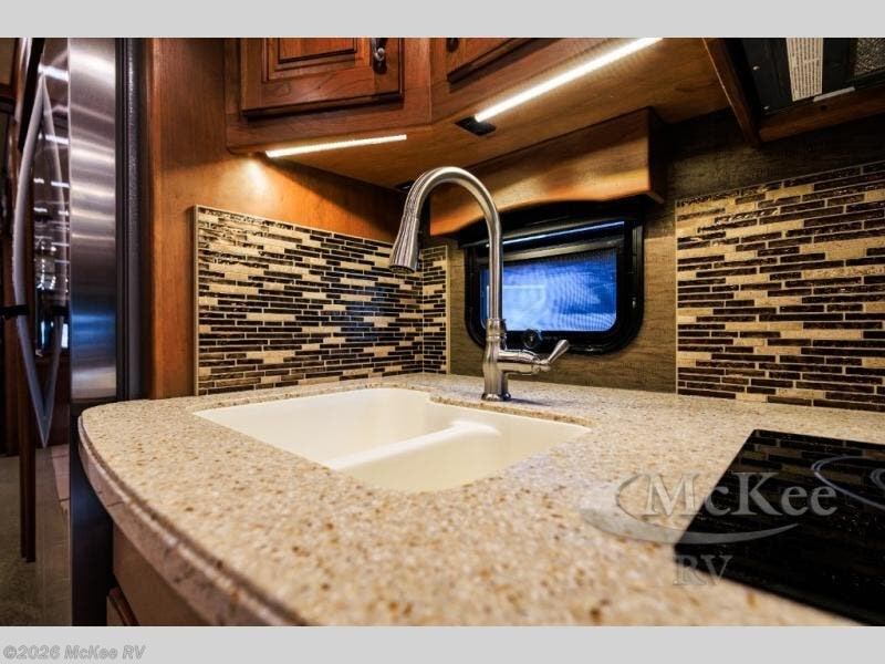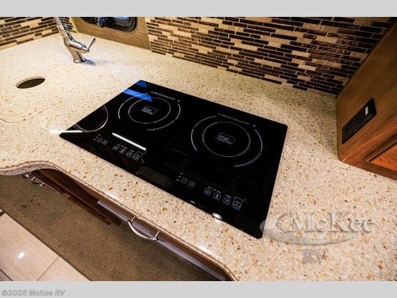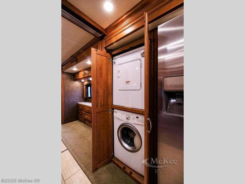 There is an expandable jackknife L-sofa within the road side full slide out and includes a pull-out galley extension, a two burner range with overhead microwave oven, double sinks, and a residential refrigerator. There is also a convenient stackable washer/dryer too. It will be easy to cook up meals and snacks while you travel, as well as return home without a pile of dirty laundry!