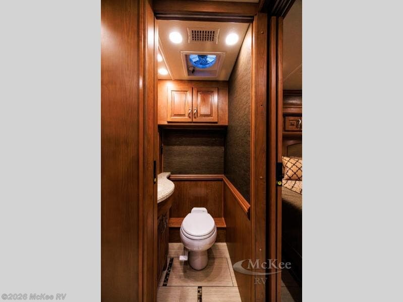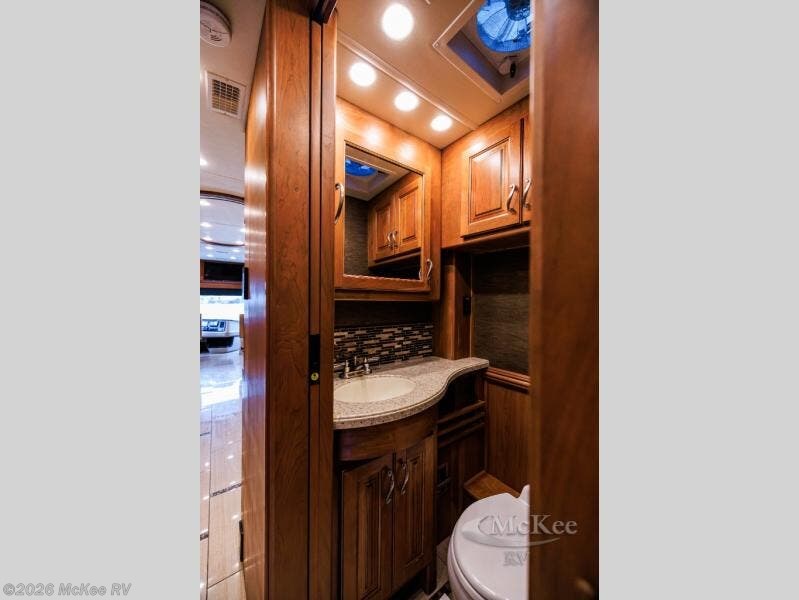 Mid-coach you will find a handy half bath including a toilet and vanity with sink. There is also an overhead medicine cabinet for your things.