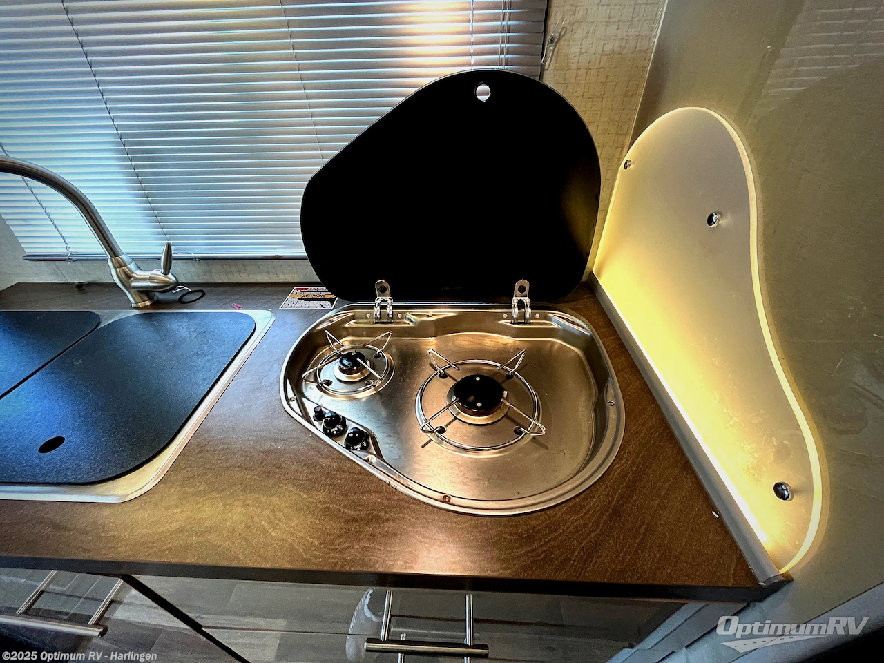 The kitchen area is to the left of the entry door and features a double sink, a two burner cook-top, and refrigerator. You will find a 28" HDTV mounted above the sink location.