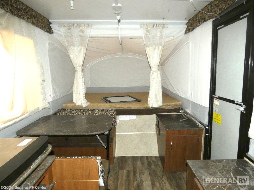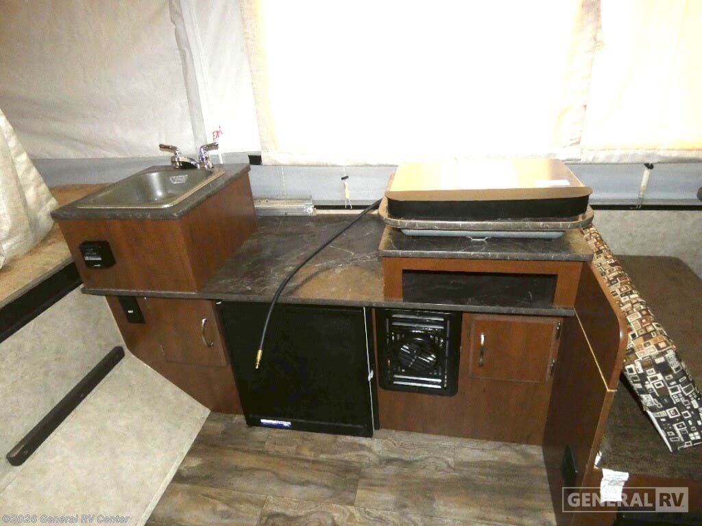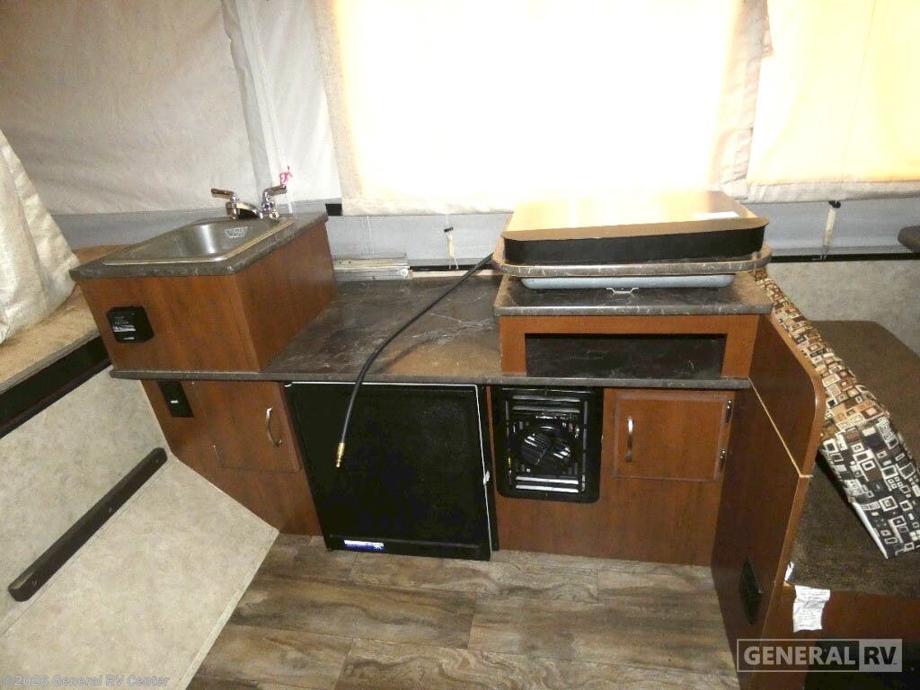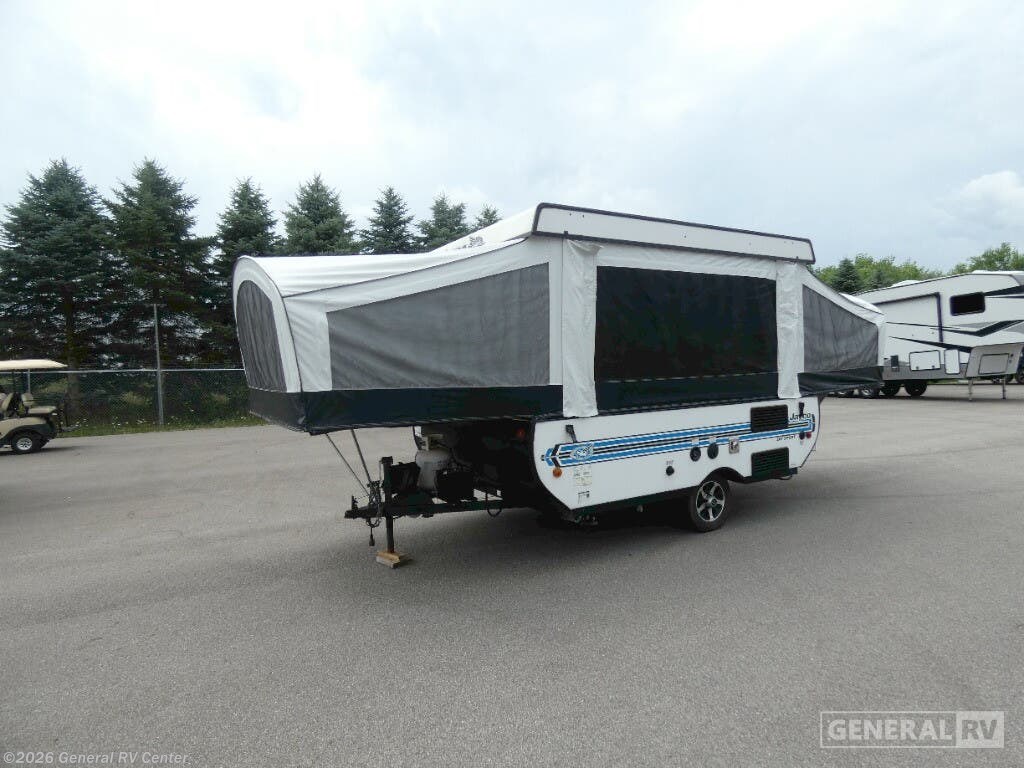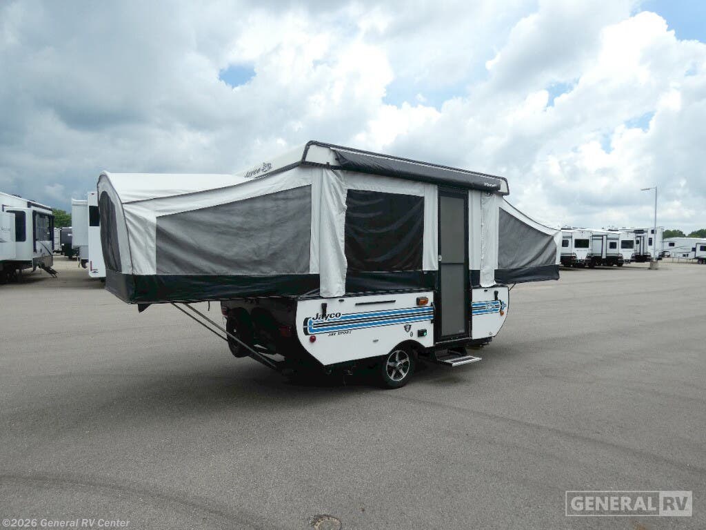 This Jay Series Sport 10SD folding pop-up camper by Jayco offers a rear full tent bed and a front queen tent bed. As you enter the camper, to the left there is a large storage cabinet. To the right of the entrance you will find a second storage cabinet. The opposite side of the camper offers a dinette, two burner range, and sink. Outside you can enjoy meal prep with a carryout two burner stove, and more!