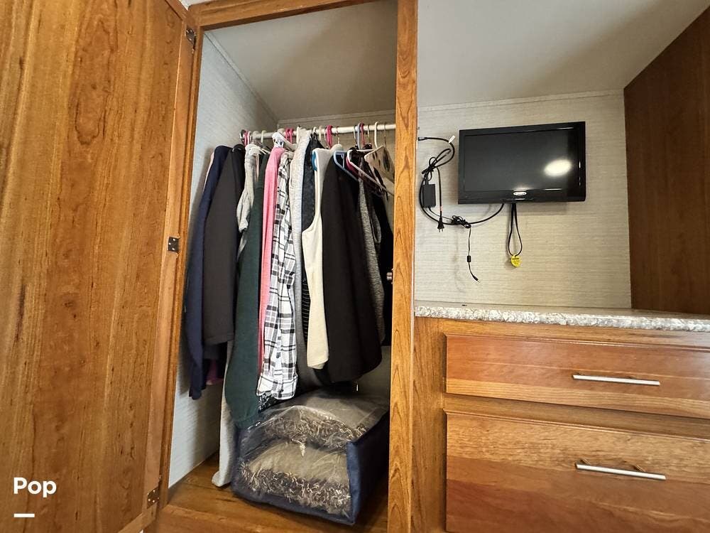 The rear bedroom features a walk-around queen bed in the second slide-out, wardrobes on each side, and a TV and drawers in between. Additionally, overhead cabinets with reading lights accentuate this bed-slide floor plan.