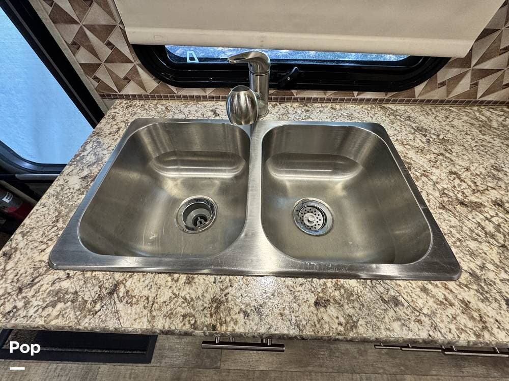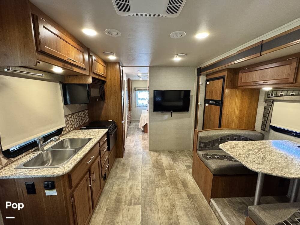 This double-slide floorplan creates a spacious living area with a booth dinette, an 8-cubic-foot refrigerator in the slide-out, and a kitchen located across from the slide on the passenger side of the coach.