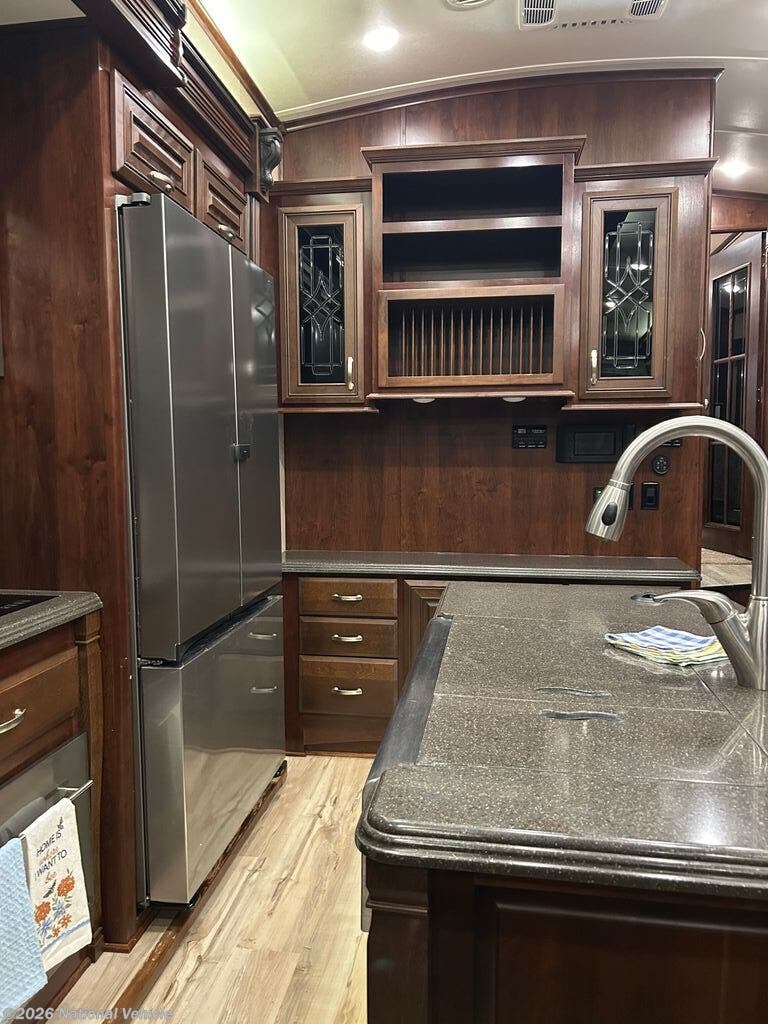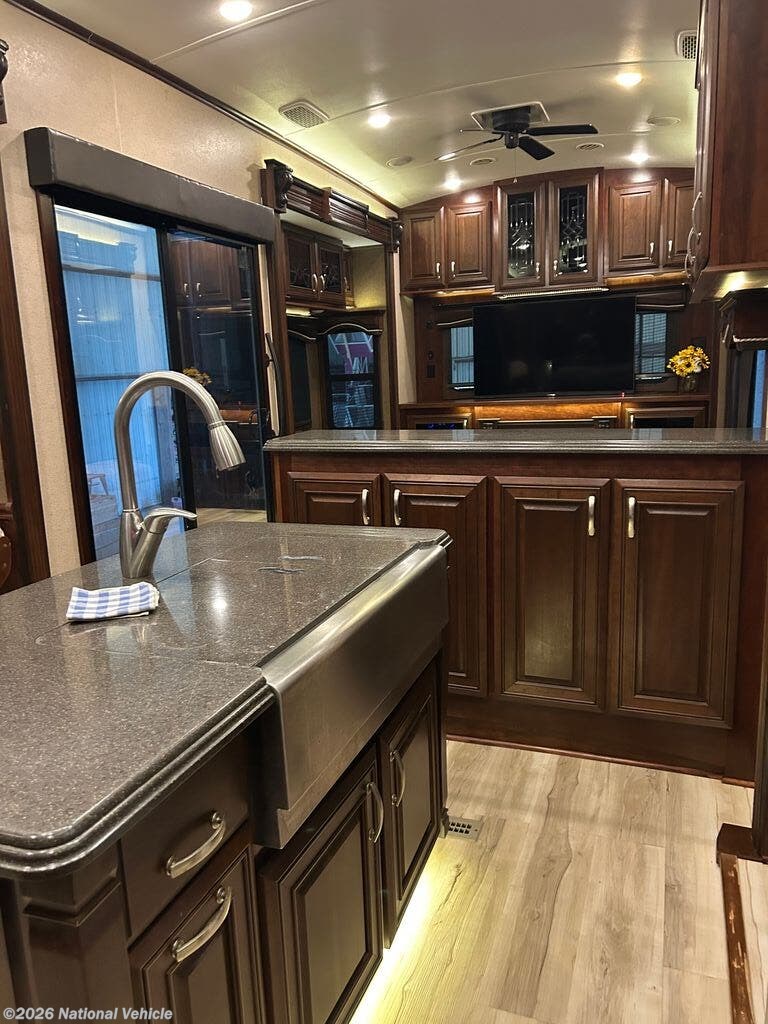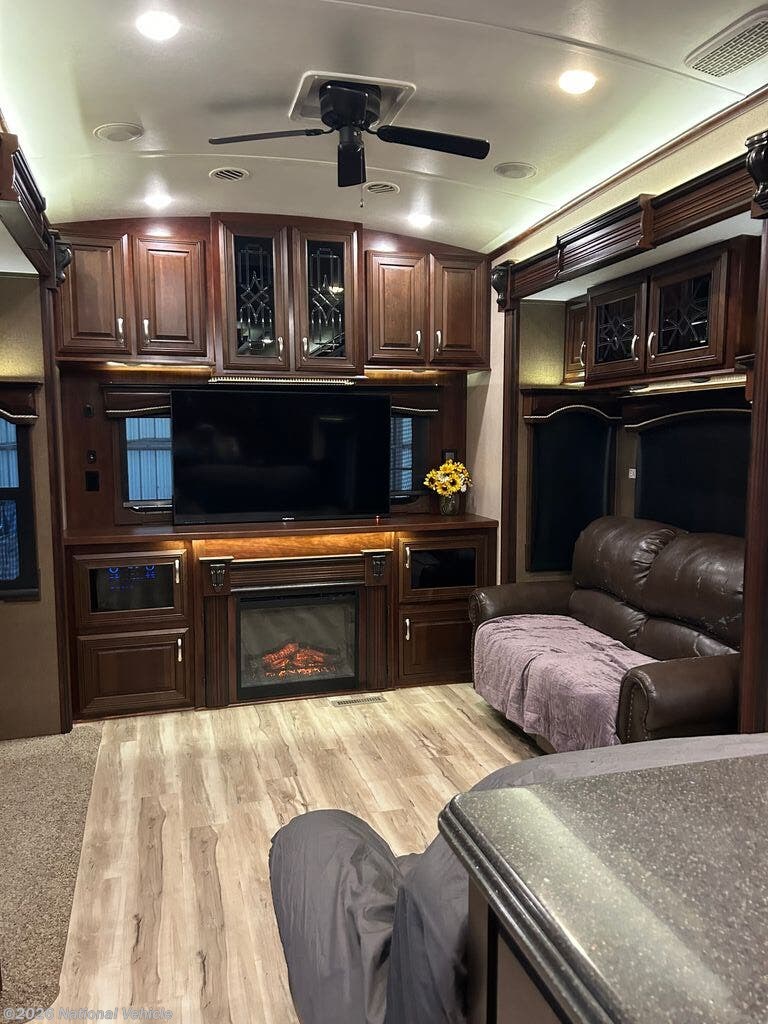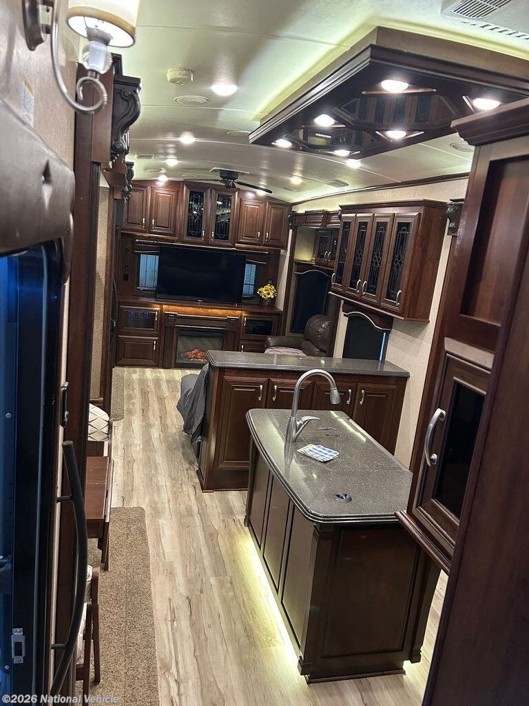 This 2017 Designer fifth wheel model 39RE by Jayco features FIVE slide outs, 3 ac units, a rear entertainment layout including a fireplace, a convenient kitchen island, king size bed, and a patio door, plus so much more! Enter through the 60" sliding patio door and notice the rear entertainment area with dual opposing slides. The full rear wall entertainment center features a 60? TV lift and a fireplace beneath to enjoy. This room is perfect for entertaining family or friends. To the right of the patio doors there is a spacious kitchen area with dual opposing slide outs like the living area. A table/desk combination with four chairs fills the slide along the curb side, and the slide opposite features a residential refrigerator, a two-burner range with overhead microwave oven, and a dishwasher. There is a bar top along the inside wall with storage below, a kitchen island featuring double sinks, and more storage along the inside wall in this kitchen area. Head up the steps toward the front to a side aisle bathroom on the left. There is a toilet, a vanity sinks with overhead medicine cabinet, linen storage, and a 36" x 48" shower. The very front features a spacious bedroom retreat with a king-sized slide-out bed including shelves on both sides. A chest with 39" TV lift opposite, and a front walk-in closet are perfect for your clothing. There is also a corner cabinet that has a stackable washer and dryer. Outside there is a roll out cover with a slide out 39? tv with storage the full width of camper. There is an automatic satellite dish to supply feed to all 3 tv?s. In the front storage you will find an Onan generator with more storage as well.