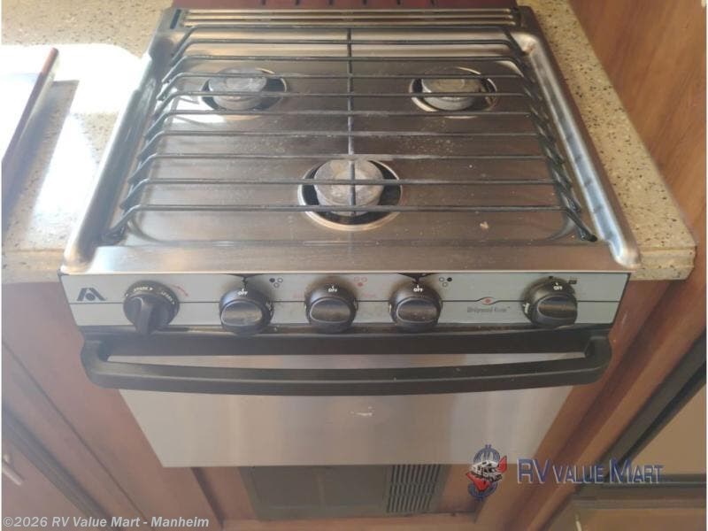 As you enter the travel trailer, to the left is an angled double kitchen sink, three burner range, microwave, refrigerator, and a pantry. The opposite side of the trailer offers a slide with an u-dinette or choose a table with chairs, and a hide-a-bed sofa. Next to the sofa is an entertainment center and a bench with storage.