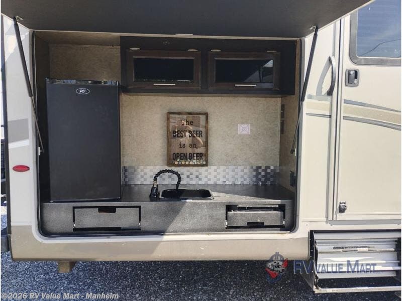 Outside you are sure to enjoy the exterior kitchen with a refrigerator, sink, and a two burner cooktop. Don't forget about the exterior storage for your outdoor gear and the 18' awning for some outside shade, plus much more!