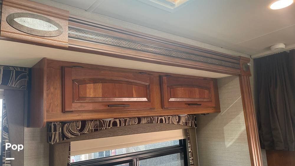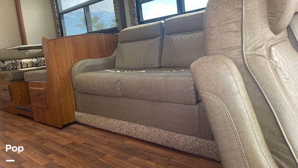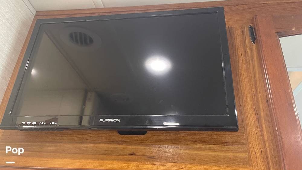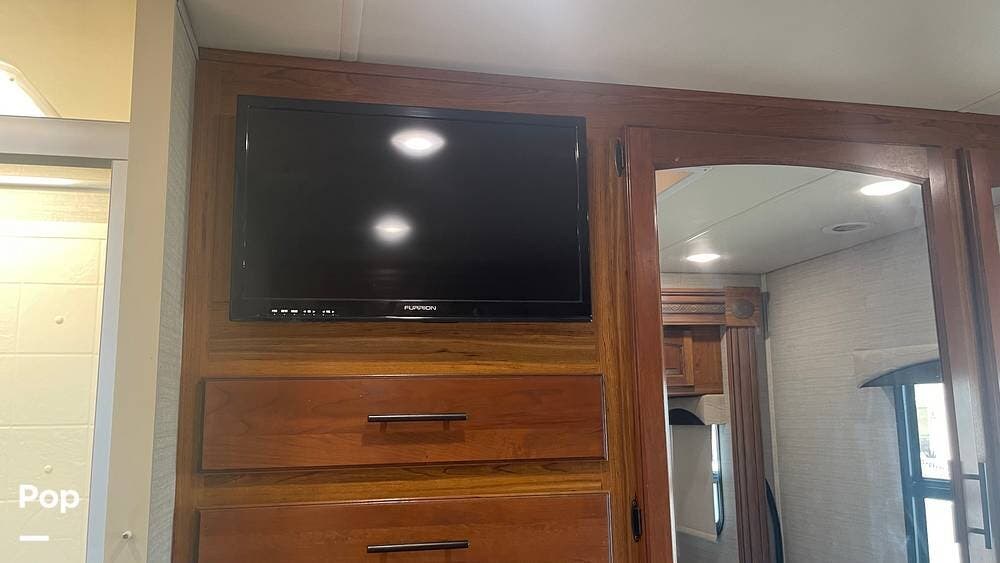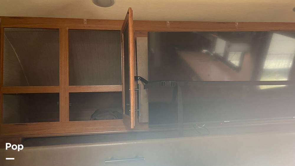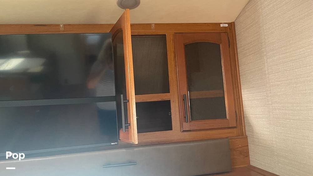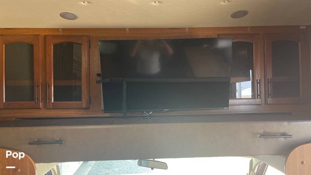 The living area has a booth dinette, a sleeper sofa, and an overhead cab area. The overhead cab area is unique (extra add-on option), with a large TV and more cabinets across the front of the cab.