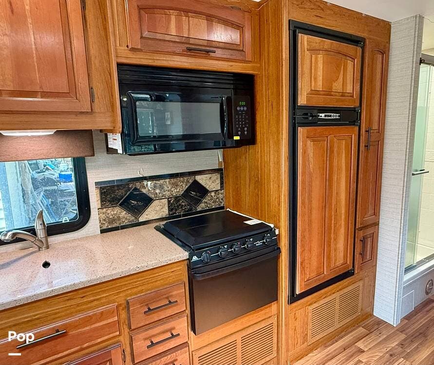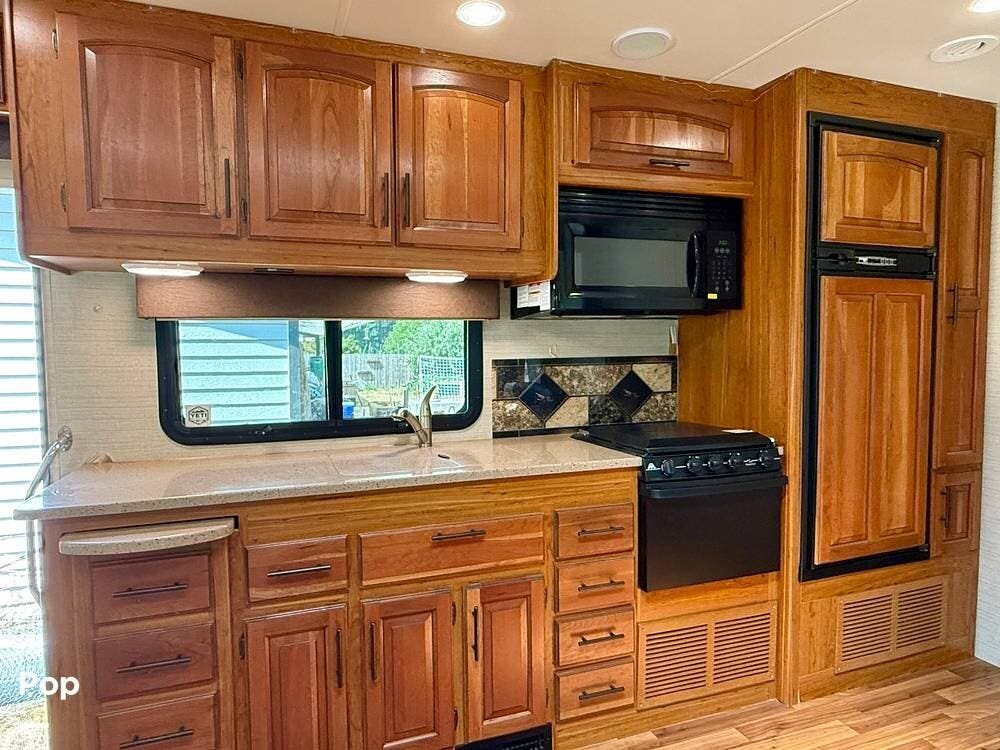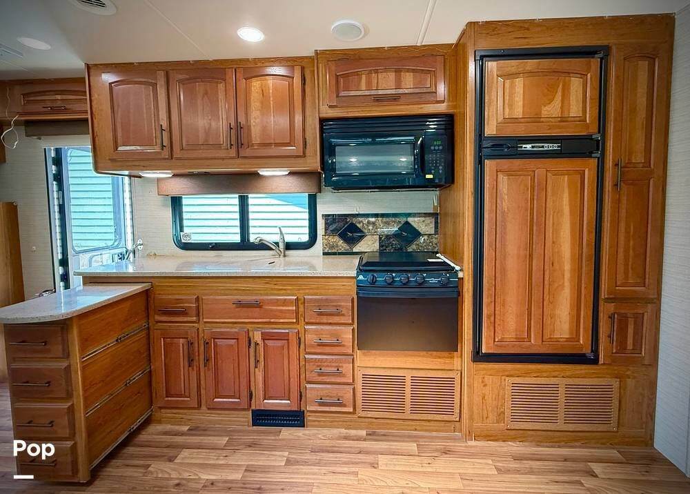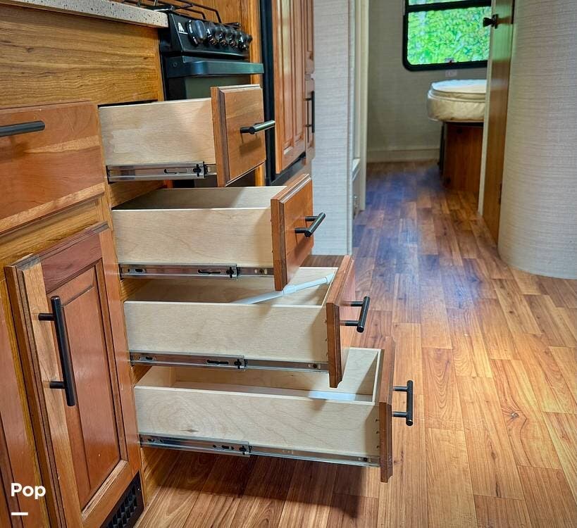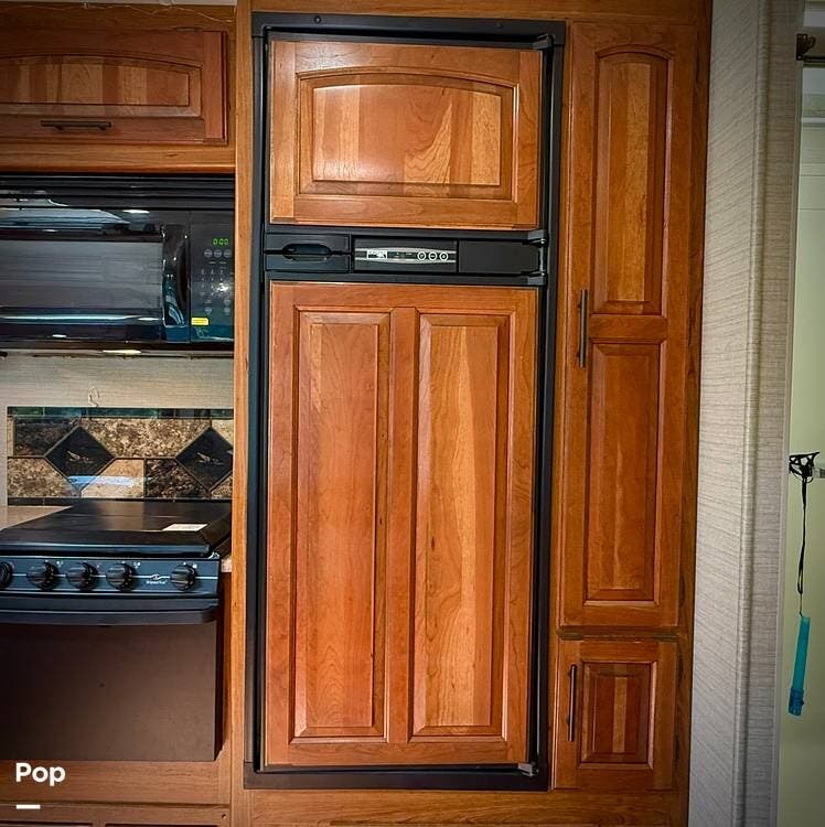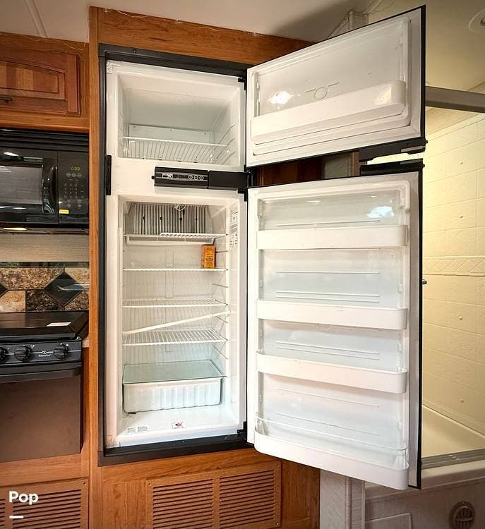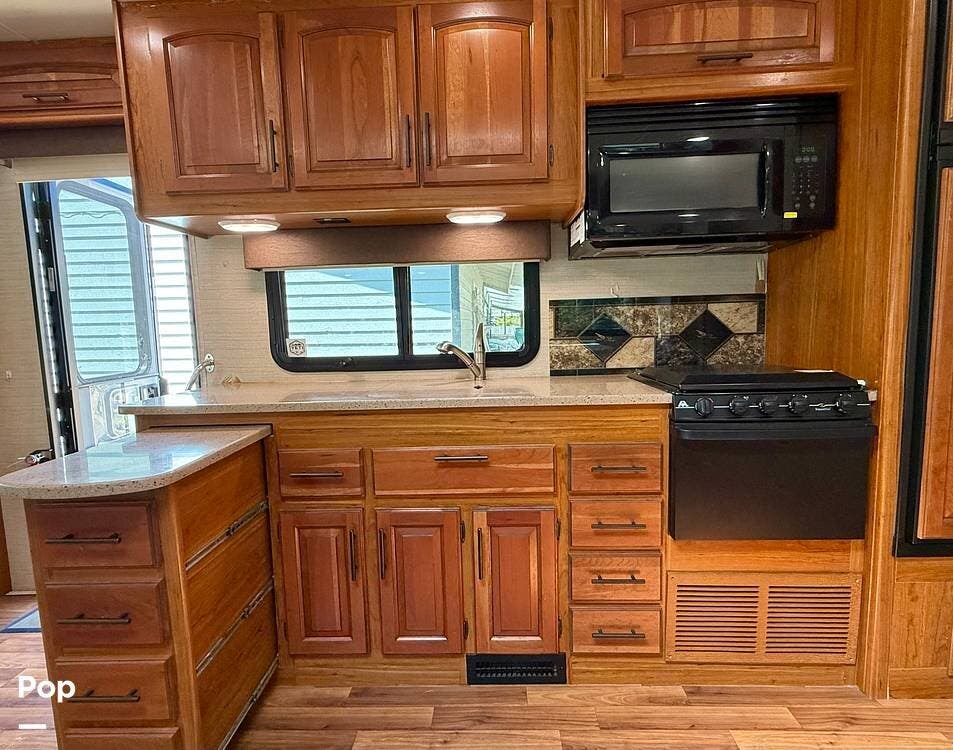 The kitchen is well-equipped with a 3-burner SuperBurner range, microwave, double sink with covers, solid-surface countertops, pantry, and an 8-cubic-foot refrigerator. You'll enjoy the extra counter space with the pull-out counter extension enhanced by the Honey Cherry cabinetry that adds warmth and style.