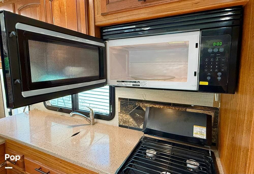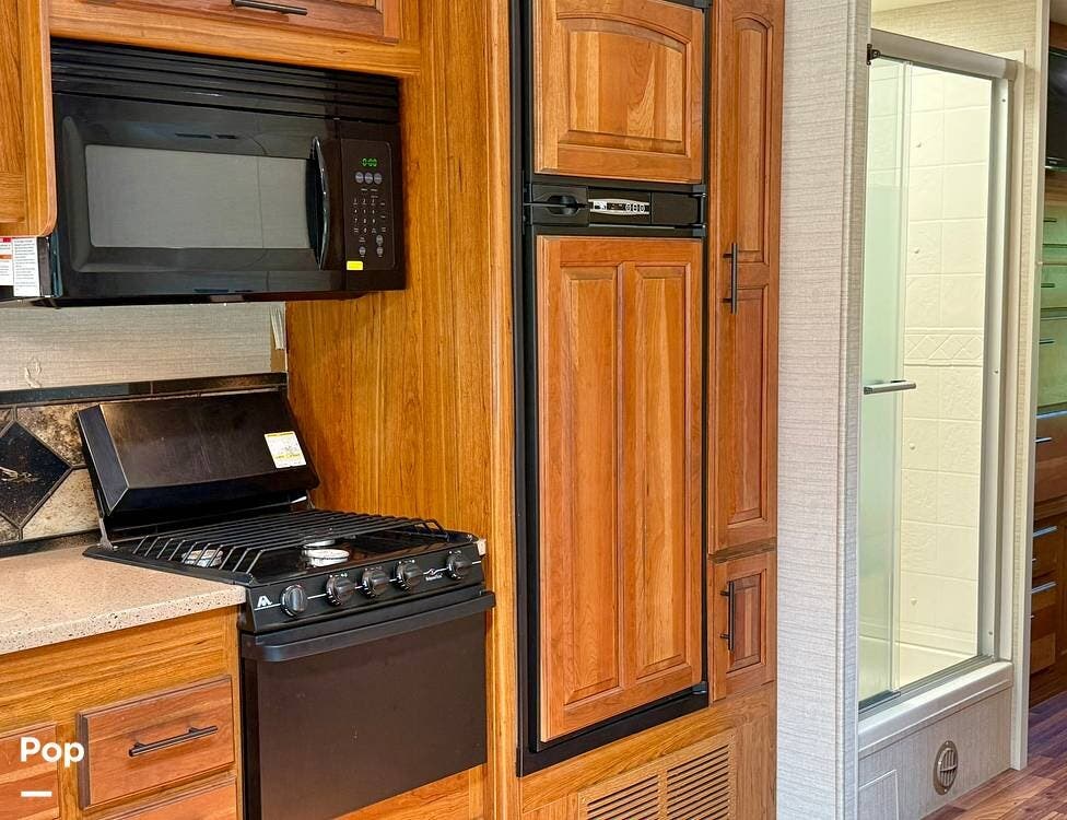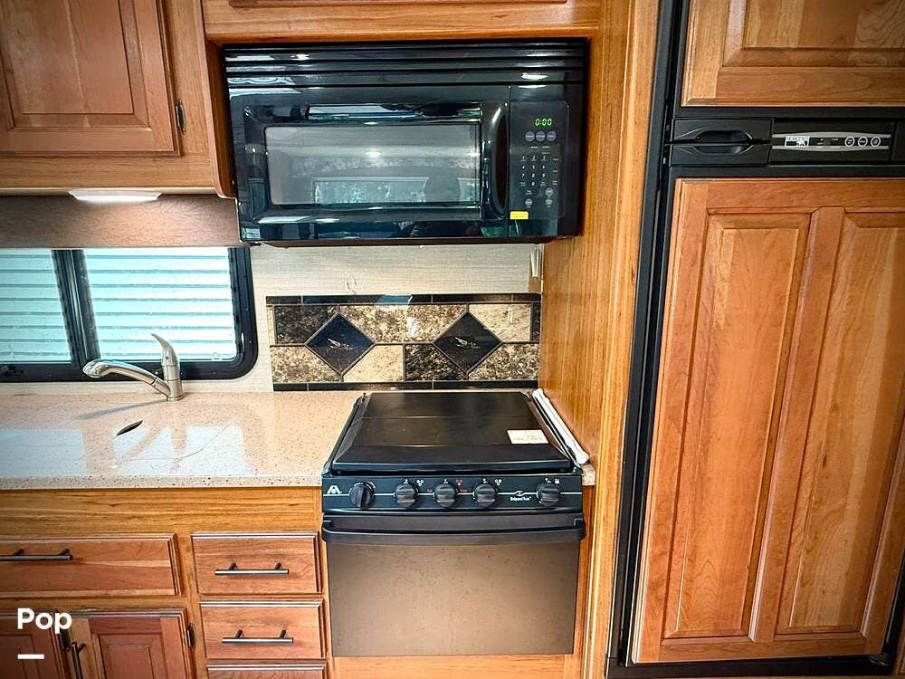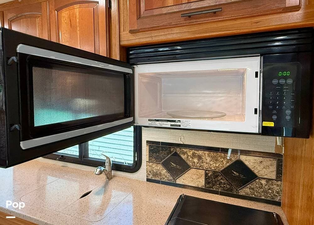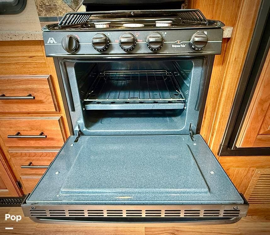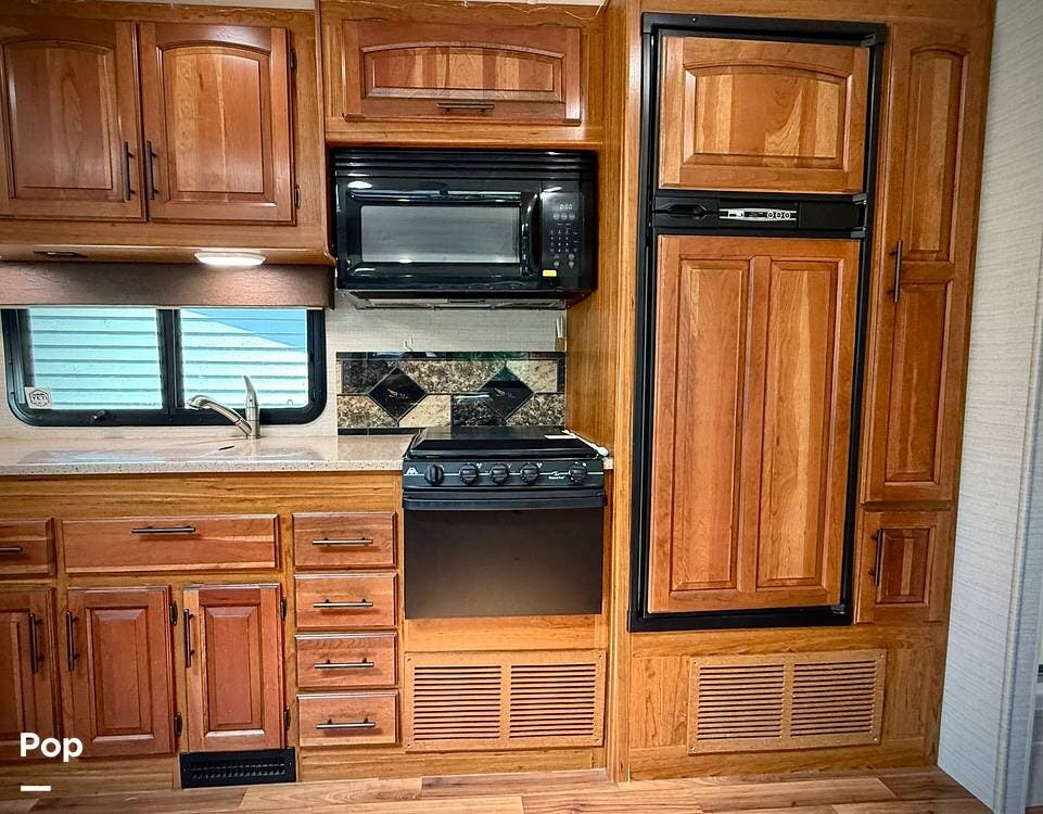 The kitchen is well-equipped with a 3-burner SuperBurner range, microwave, double sink with covers, solid-surface countertops, pantry, and an 8-cubic-foot refrigerator. You'll enjoy the extra counter space with the pull-out counter extension enhanced by the Honey Cherry cabinetry that adds warmth and style.