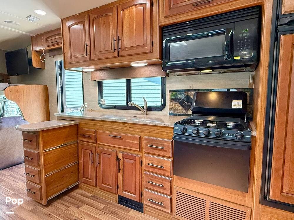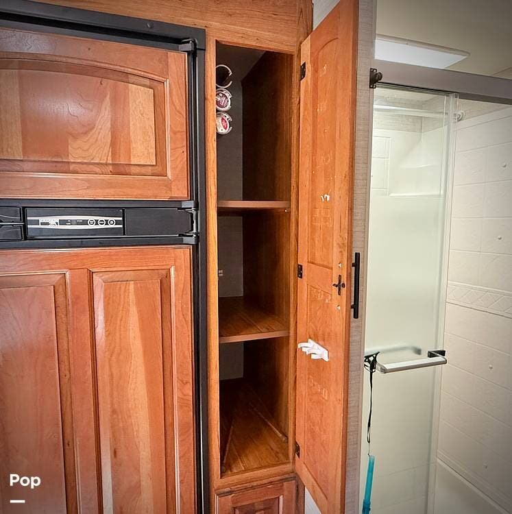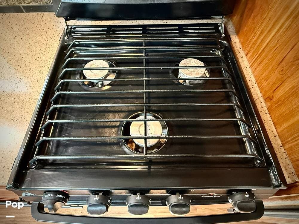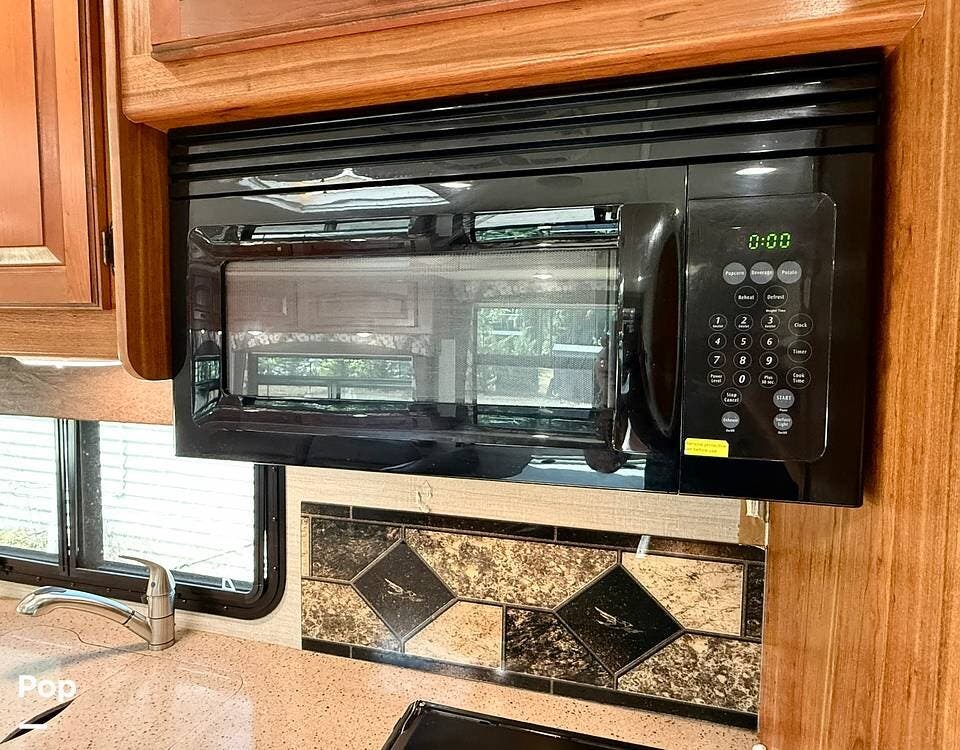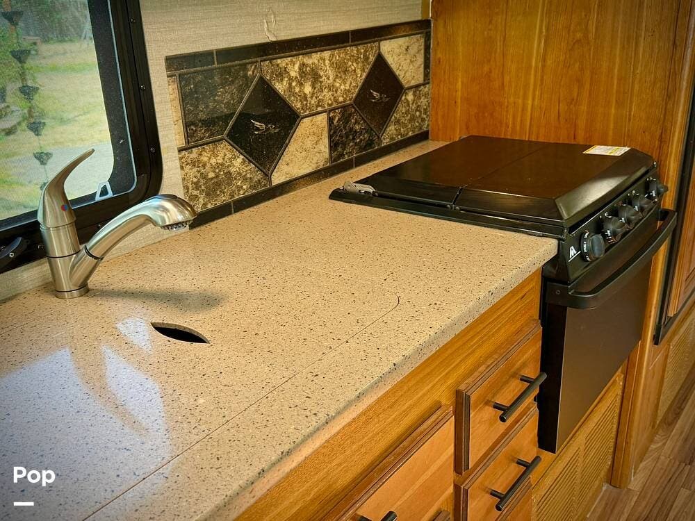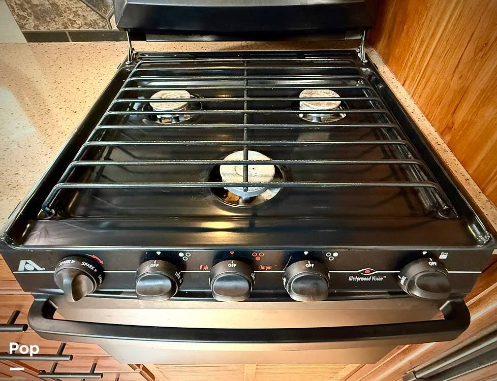 The kitchen is well-equipped with a 3-burner SuperBurner range, microwave, double sink with covers, solid-surface countertops, pantry, and an 8-cubic-foot refrigerator. You'll enjoy the extra counter space with the pull-out counter extension enhanced by the Honey Cherry cabinetry that adds warmth and style.
