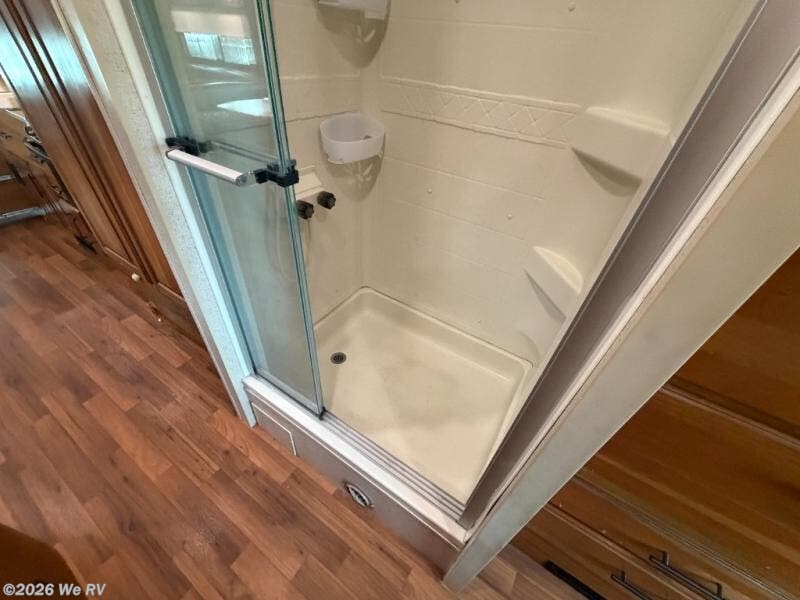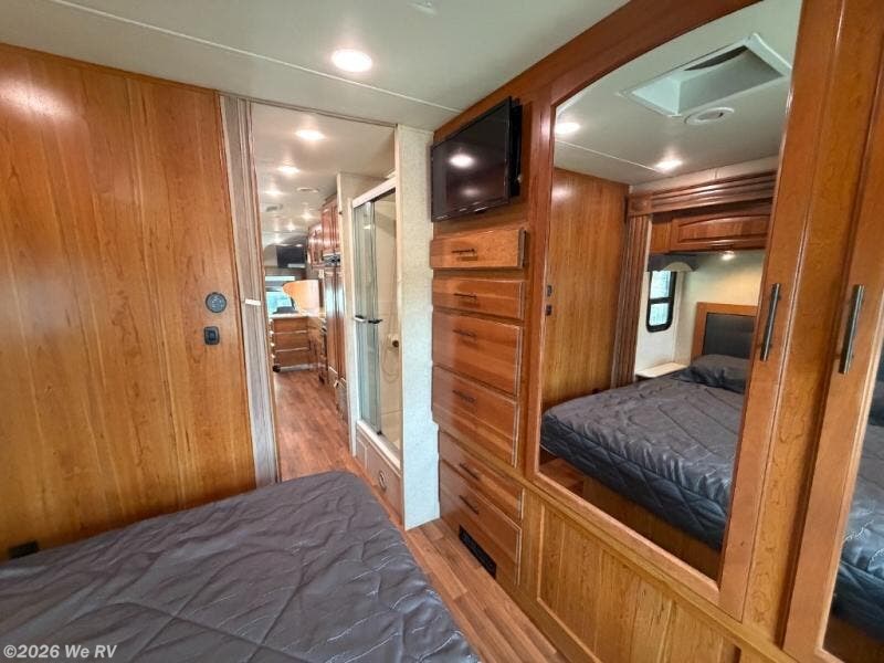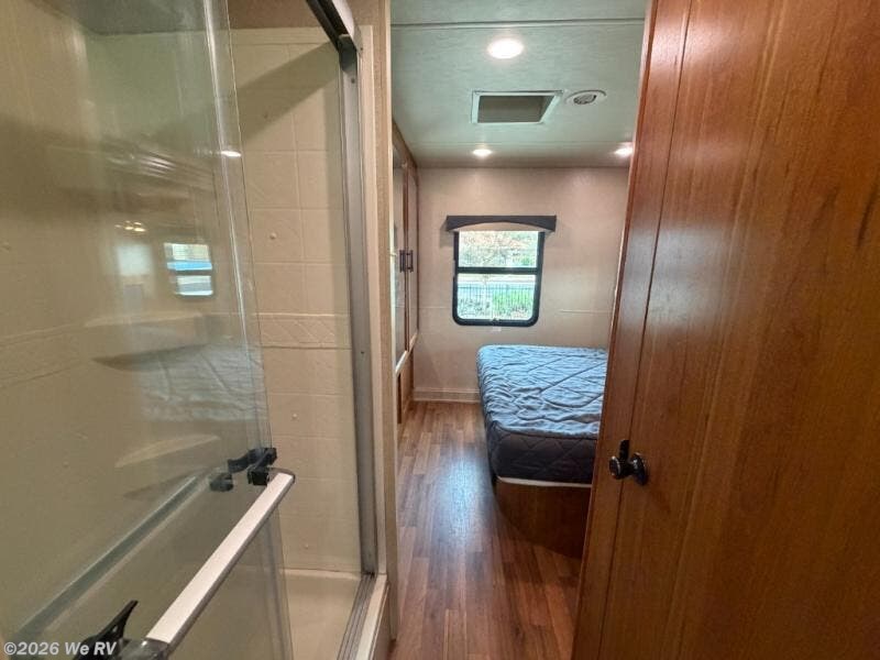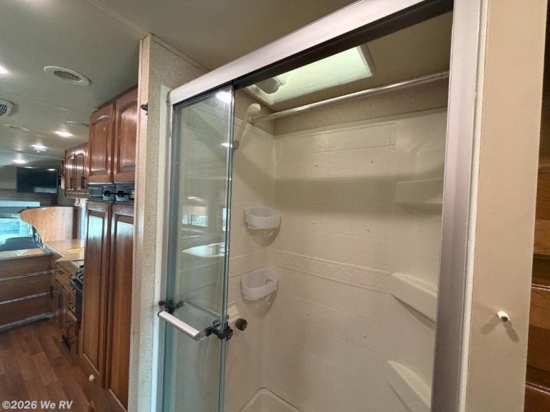 As you proceed toward the rear of the motor home, you will walk through the bathroom. There is a private toilet area with a sink, and medicine cabinet. The shower is across the hallway. The rear bedroom has a queen bed and nightstands slide. There is also a wardrobe and TV cabinet in the bedroom.