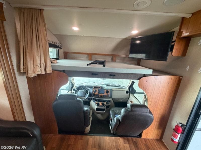When you step inside the Greyhawk 29MV class C gas motor home by Jayco, you will be impressed with how well the floorplan space is used. To the left of the entrance there is a counter with a pull out countertop with drawers, a double kitchen sink, three burner range, microwave, refrigerator, and a pantry. Behind the driver's seat you will find a sofa with overhead cabinets and dinette slide. Above the driver's seat is a cab-over bunk with TV overhead cabinet for extra sleeping space.