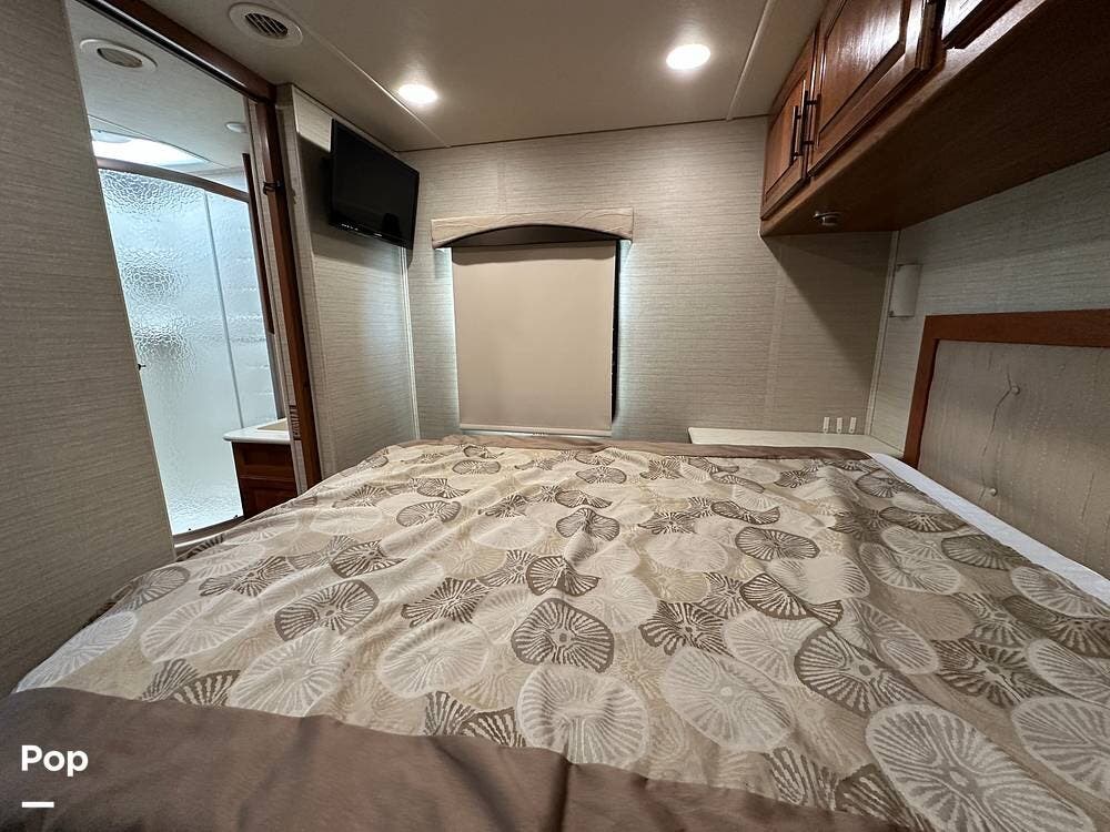 The private bedroom offers a quiet retreat at the end of the day, with a comfortable queen bed, storage cabinets, and wardrobes for all your clothes and travel gear. The bathroom is well laid out with a roomy shower, vanity, and toilet, making it easy to feel at home no matter where you park. Every inch of this coach was designed to give you space where it matters and storage where you need it.