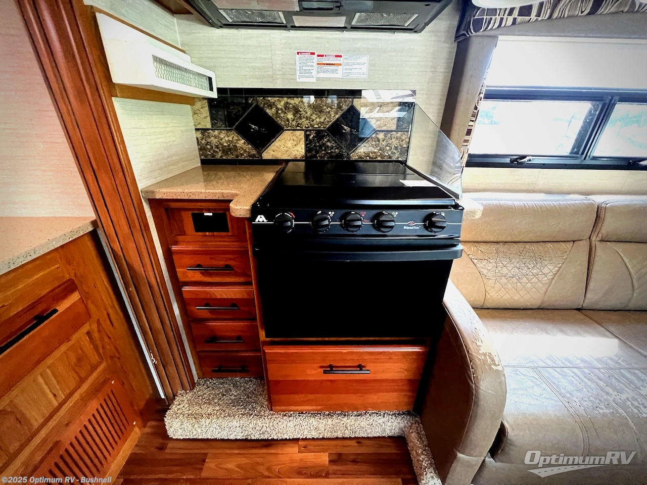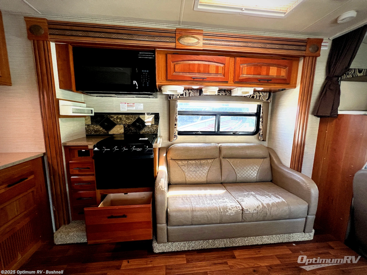 Stepping inside the Greyhawk 31FS motor home by Jayco, you will be in the living/kitchen areas. To the left of the entrance is a refrigerator. To the right of the entrance is a booth dinette. There is a cab-over bunk for added sleeping space, or if you prefer, choose the optional front entertainment center. Behind the driver's seat there is a slide with a sofa, three burner range, and microwave. The double kitchen sink is located just past the slide.
