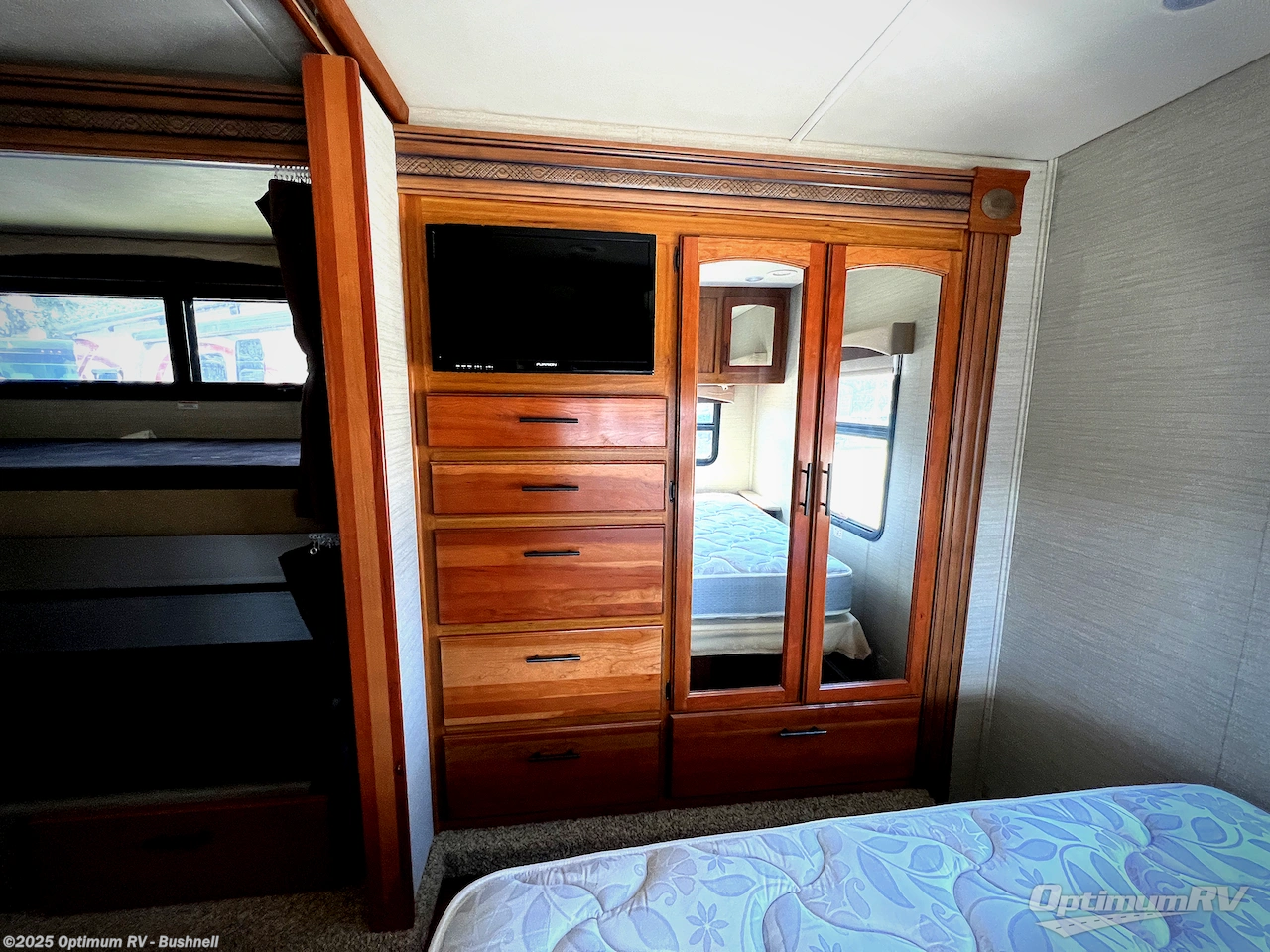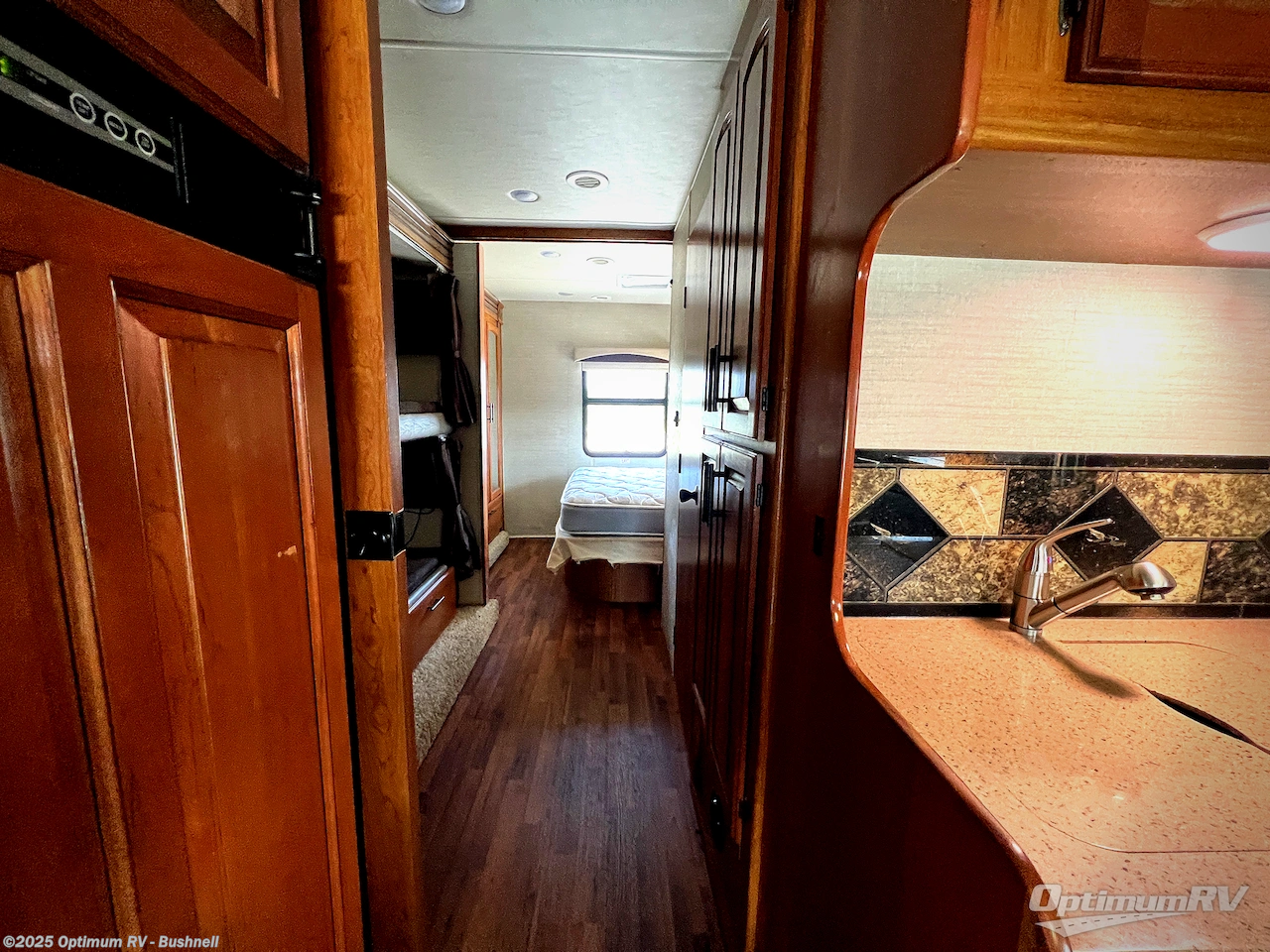 As you proceed toward the back of the motor home, you will find the bathroom and bedroom. The bathroom has a sink, medicine cabinet, toilet, and shower. Across from the bathroom there is a slide out with a set of bunk beds and continuing into the bedroom you will find a large wardrobe. The bedroom also offers a queen bed and nightstands.