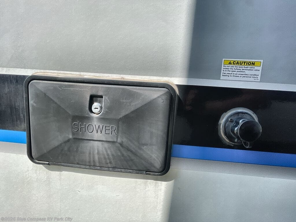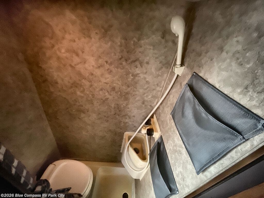 The wet bath is opposite, and to the left of the entry door. Here you will find a shower and toilet. This is definitely a convenience that makes camping more fun to have your own on-board bath facilities.