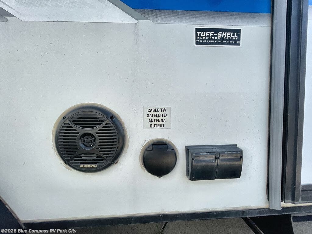 Step inside and notice the booth dinette across the front where you can easily enjoy your meals or games. There is a shelf overhead for storage. This can also be used for sleeping with the table folded down for one adult or two children. With the entertainment center to the left of the door facing the dinette you have a great spot to catch your favorite show, or news programs.