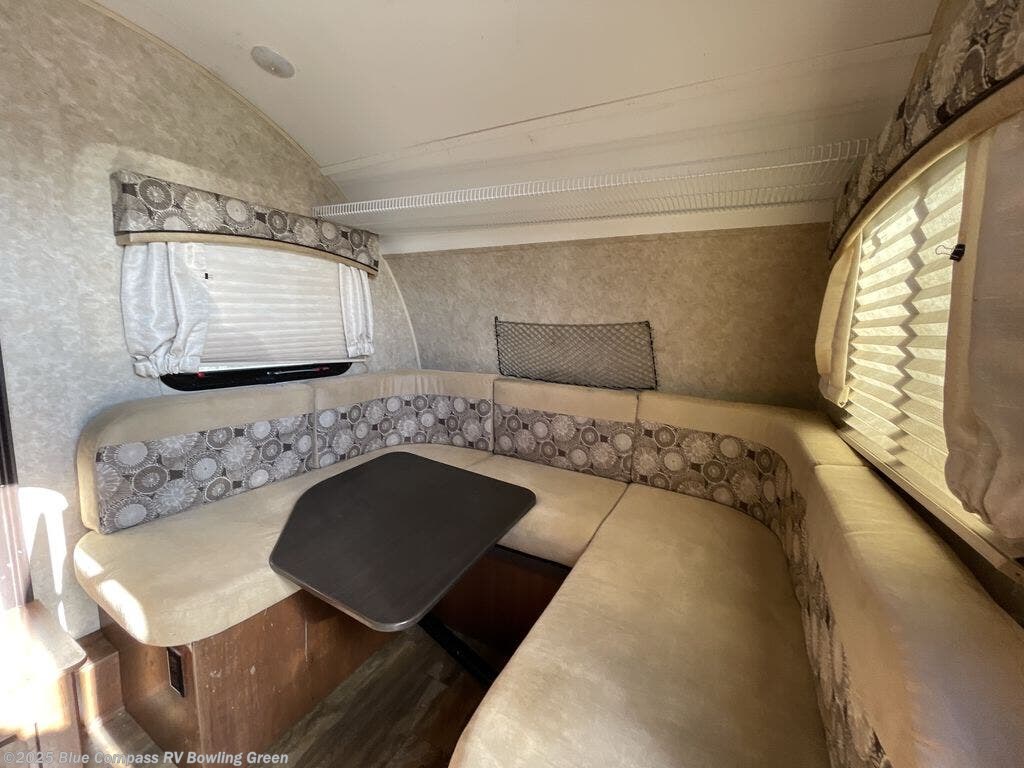As you step inside this travel trailer, to your immediate left there is an entertainment center with storage behind. Along the front of this model there is the u-dinette where you can enjoy your meals during the day, and at night convert this area to sleeping space.