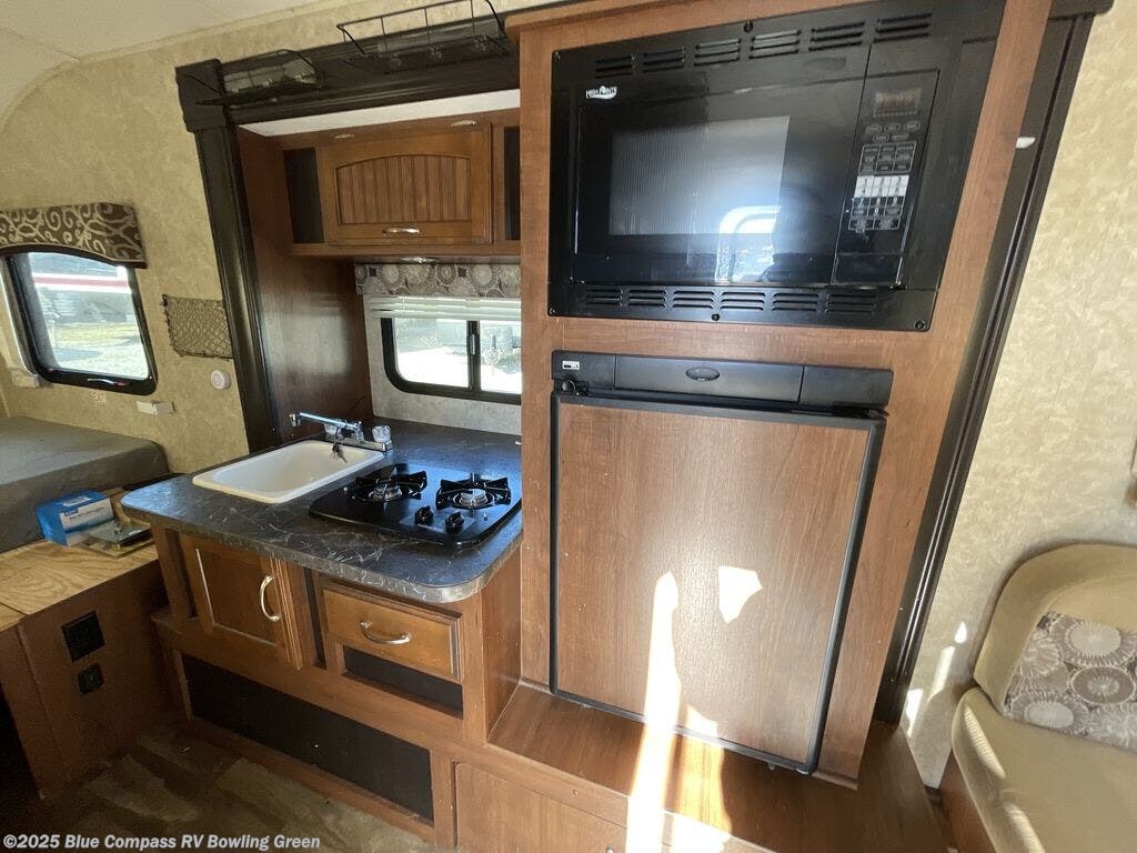 Across from the door there is a slide out with a refrigerator, microwave, a two burner range, and a single sink.