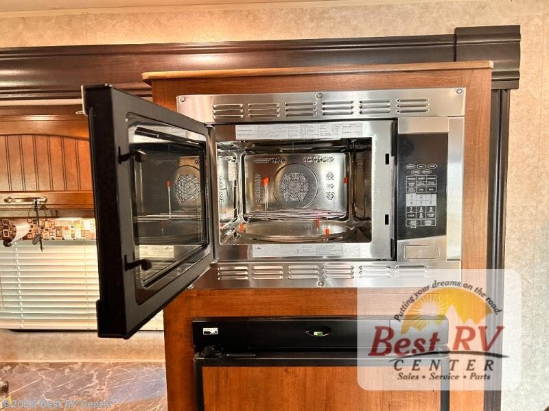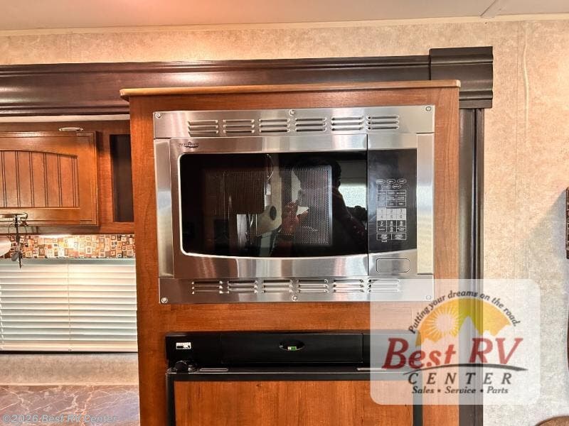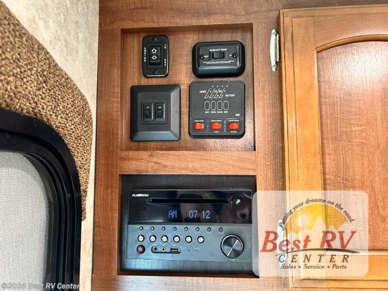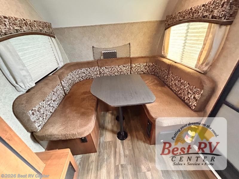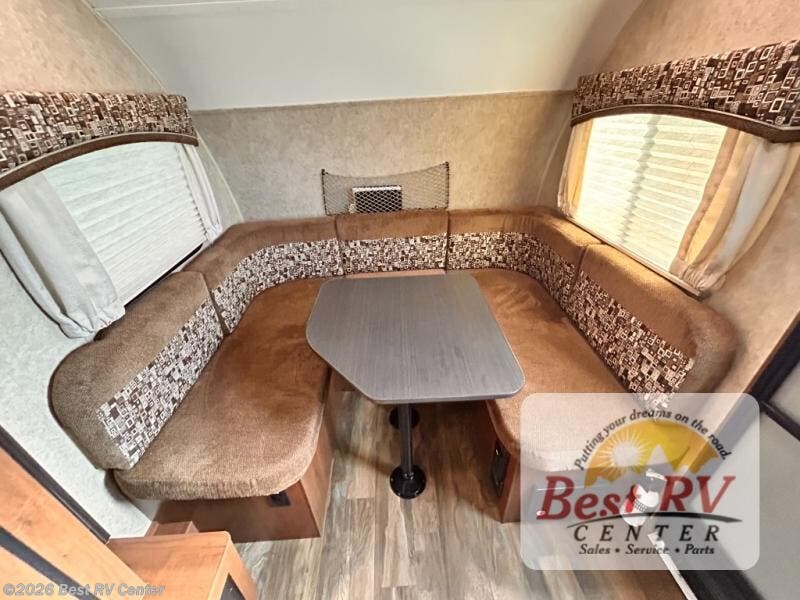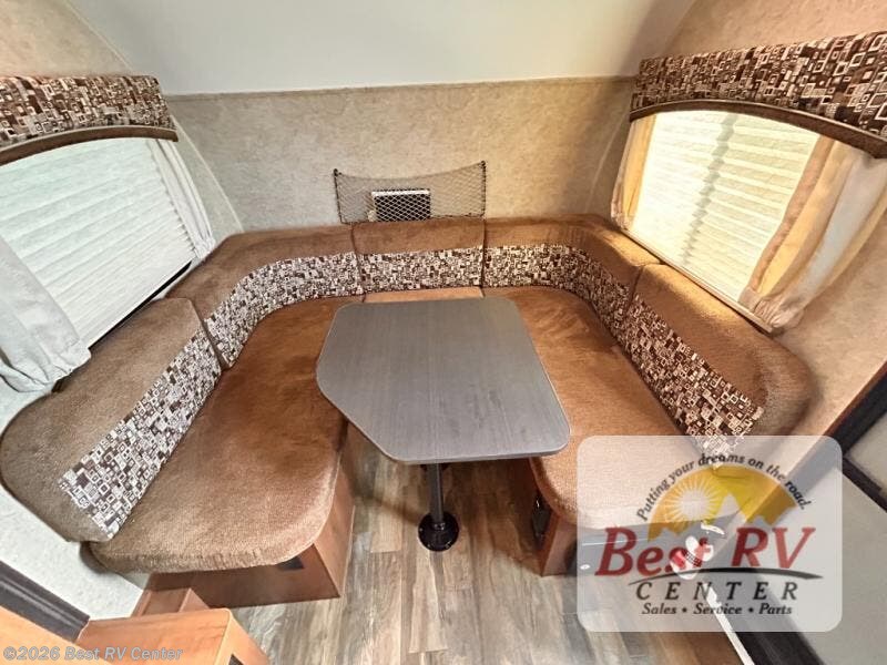 As you step inside this travel trailer, to your immediate left there is an entertainment center with storage behind. Along the front of this model there is the u-dinette where you can enjoy your meals during the day, and at night convert this area to sleeping space.