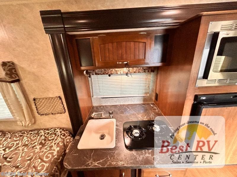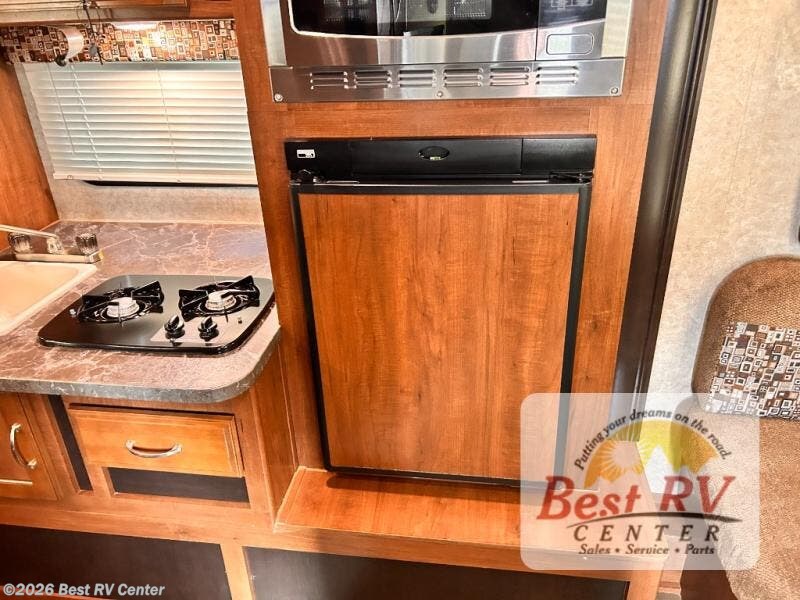 Across from the door there is a slide out with a refrigerator, microwave, a two burner range, and a single sink.