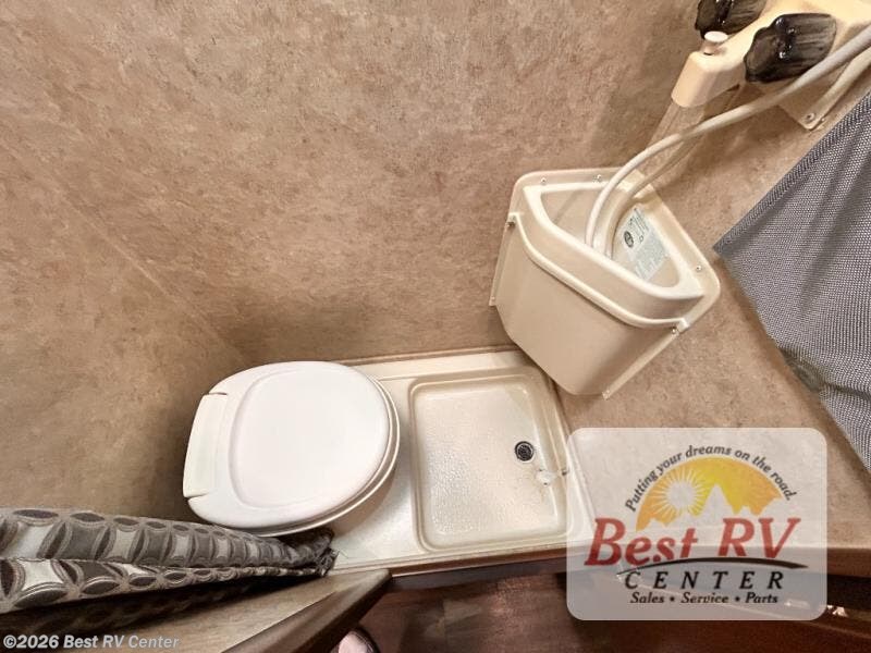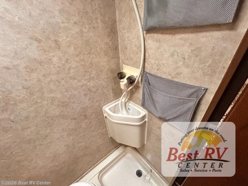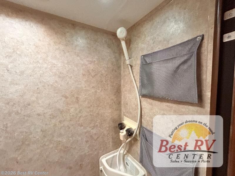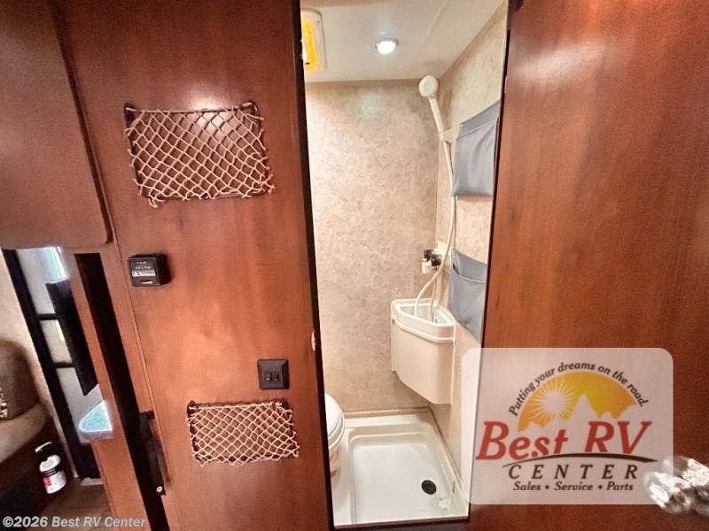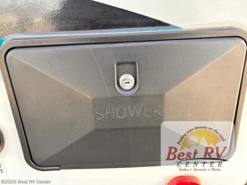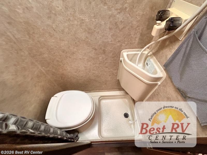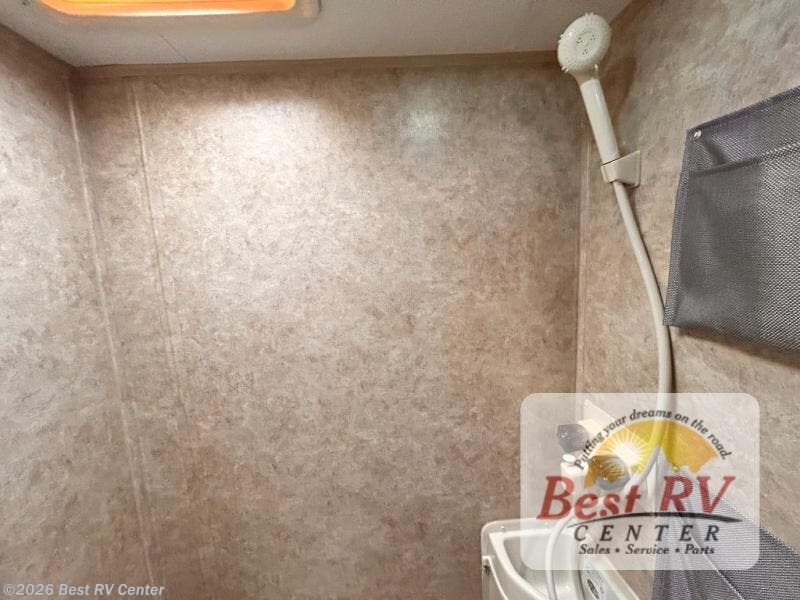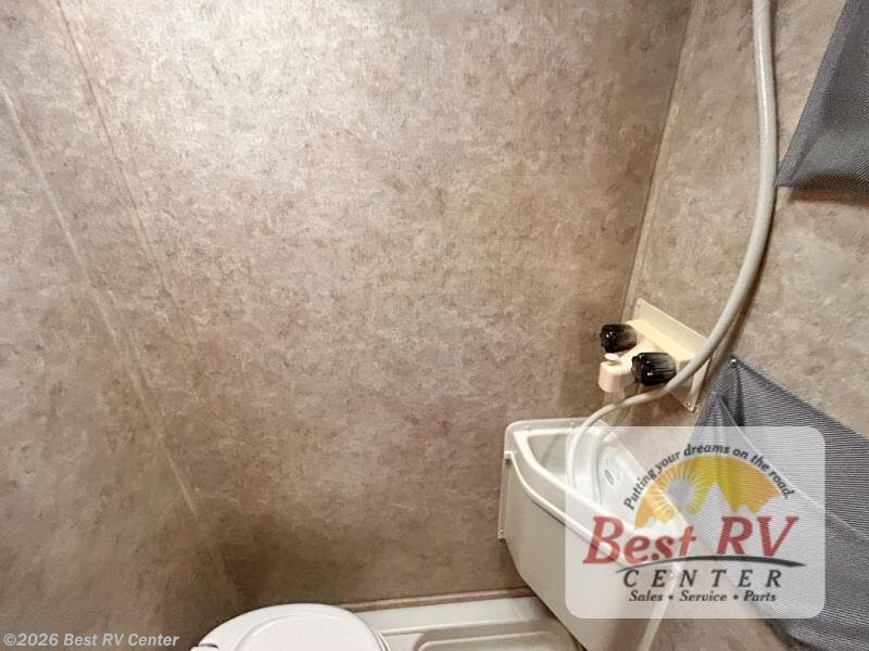 Along the opposite side of the trailer, across from the kitchen is where you will find the convenient wet bathroom with a toilet and shower. And located in the very rear of this model is a queen bed.