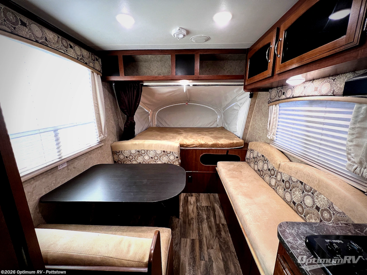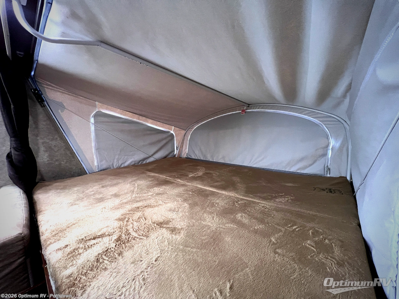 This Jay Feather 7 model 16XRB expandable by Jayco offers rear and front tent end beds, a bench sofa, and rear bath.